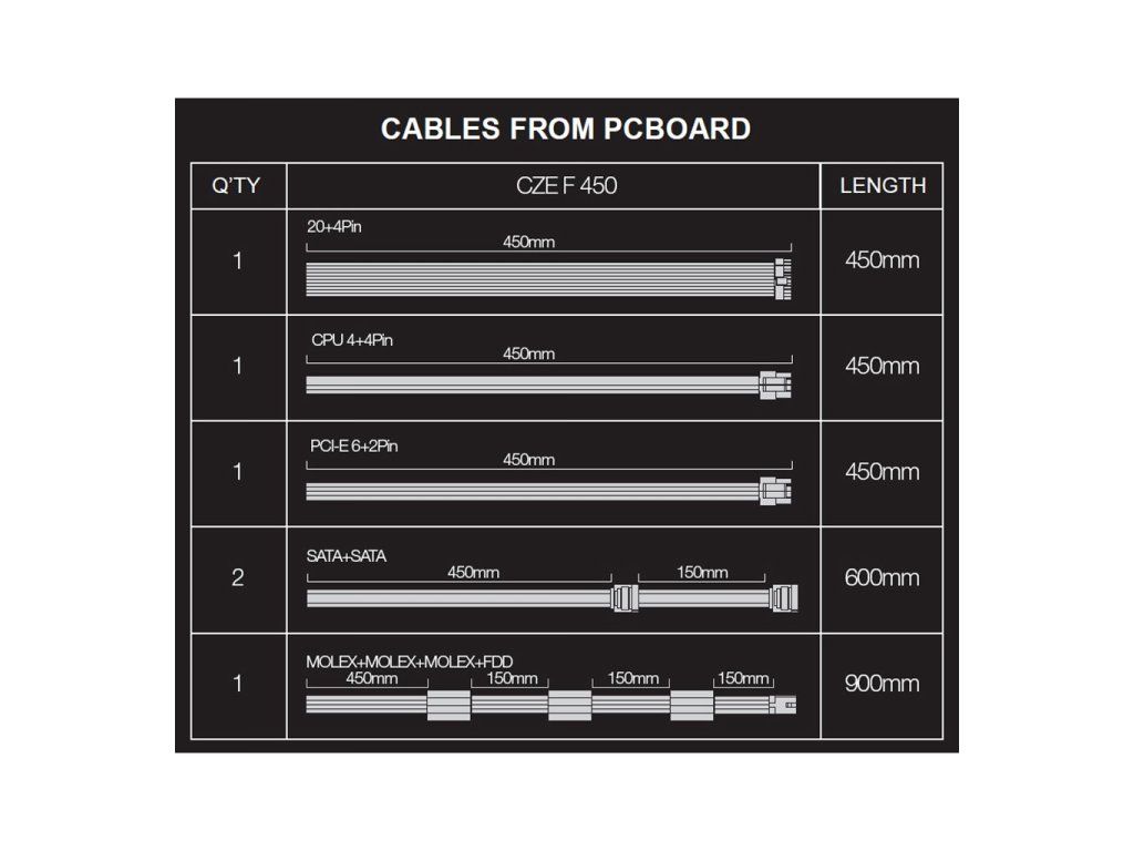 Specifikace • Ventilátor 14 cm, zelený • Aktivní PFC • Certifikace 80+ • Účinnost minimálně 82%/85%/82% při zatížení 20%/50%/100% • Ochrana proti zkratu, přetížení, přepětí a podpětí Kabeláž • 1x MB 20+4pin 450 mm • 1x cpu 4pin (8pin - 4+4) 450 mm • 1x VGA PCI-E 6+2pin 450 mm • 1x MOLEX, 450mm + MOLEX 150mm + MOLEX 150 mm + FDD 150 mm • 2x kabel S-ATA 450mm+ S-ATA150mm • černá barvaDodatočné parametre