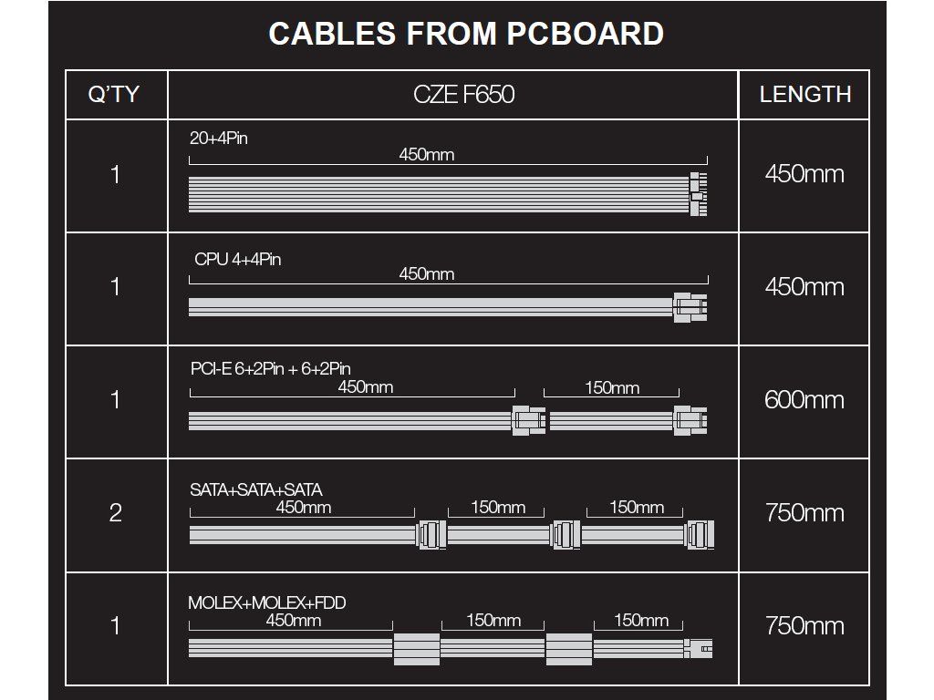Specifikace • Ventilátor 14 cm, zelený • Aktivní PFC • Certifikace 80+ bronze • Účinnost minimálně 82%/85%/82% při zátížení 20%/50%/100% • Ochrana proti zkratu, přetížení, přepětí, podpětí a tepelná ochrana • semi-pasivní chlazení do 20% zatížení Semipasivní chlazení, ventilátor zdroje je obvykle neaktivní a spustí se pouze při překročení 20% hranice výkonu zdroje. Kabeláž • 20+4 Pin (450mm) • CPU 4+4 pin (450mm) • PCI-E (6+2) +(6+2)pin (450+150mm) • Sata+Sata+Sata (450+150+150mm) • Sata+Sata+Sata (450+150+150mm) • Molex+Molex+FDD (450+150+150mm) • černá barvaDodatočné parametre