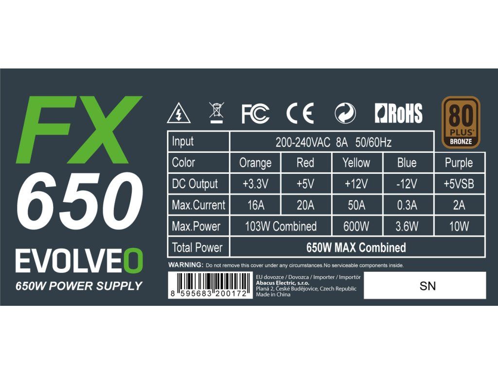 EVOLVEO FX 650, zdroj 650W ATX, 14cm, 80+, Bronze, 3YRW