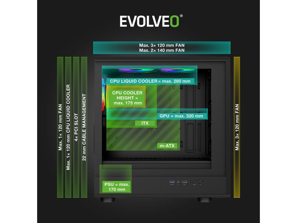 • mATX • Dřevěný čelní panel • Ventilátory ARGB 120 mm • 6x Infinity Mirror Fan • Bočnice z temperovaného skla • Tři prachové filtry • VGA max. 320 mm • CPU max. 175 mm • 2x 3,5'' HDD • 1x 2,5'' SSD