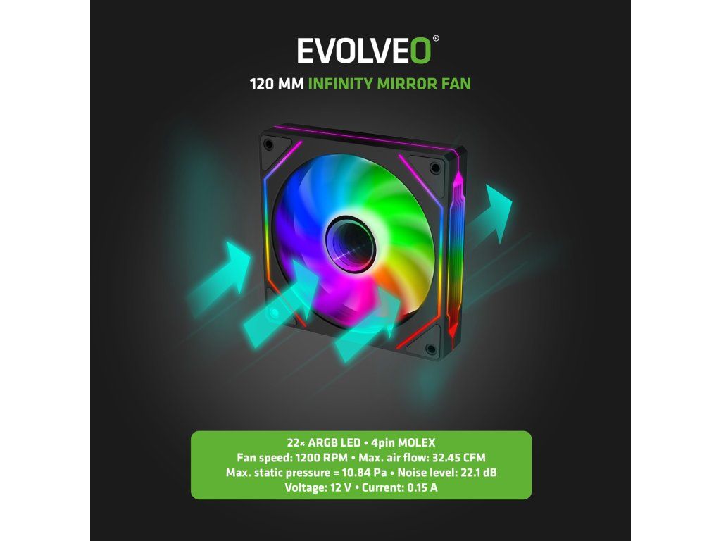 Uvnitř počítačové skříně EVOLVEO Panthera-BK-3 má základní tábor šestice ventilátorů Infinity Mirror Fan, které se starají o účinné chlazení. A taky podtrhávají styl vaší PC sestavy. Jejich součástí je totiž i barevné Multi ARBG podsvícení, navíc doplněné o zrcadla, která osvětlení neskrývají, ale znásobují – jako by se světlo snažilo odrazit kamsi do nekonečna. Není zkrátka řeč o žádných laciných světýlkách, ale o efektu, který je jednoduše úchvatný. Každý ventilátor obsahuje 22 LED diod (8 uprostřed, 14 na okrajích) a umí přepínat mezi 14 barevnými režimy – od jednobarevného osvětlení přes jemné pomalé prolínání odstínů až po futuristický mód QuickFlash, při němž vše bliká v temperamentním tempu. Tlačítko na straně skříně vám dává nad podsvícením plnou kontrolu, popř. jej můžete nechat řídit přímo základní desku.Účinné, ale tiché chlazení