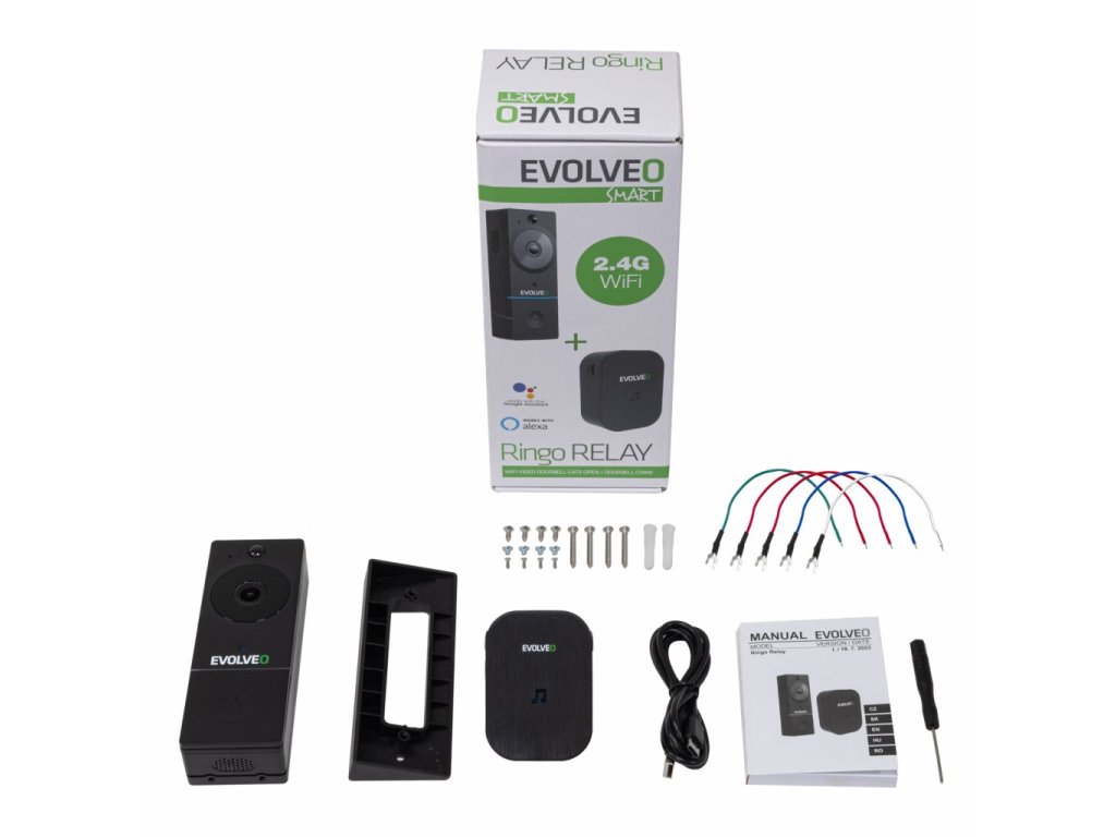 • EVOLVEO Ringo RELAY, chytrý videozvonek • Zvonek do zásuvky • Uživatelský manuál • Plochá montážní konzole • Úhlová montážní konzole • 3M samolepící montážní nálepka • Nabíjecí kabel USB-C • Malý inbusový klíč • Bezpečnostní šroub • 2x montážní šroub + hmoždinky • 2x montážní šrouby pro úhlovou konzoli • 2x připojovací vodiče pro pevnou kabeláž • 2x šrouby pro připojení vodičůDodatočné parametre