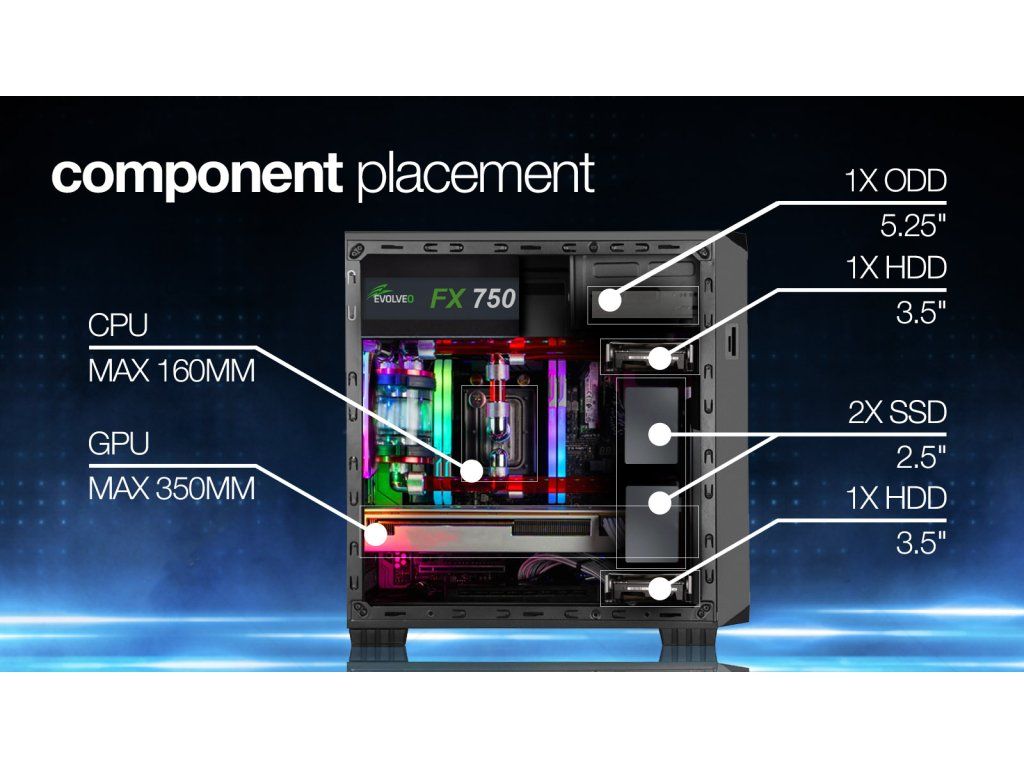 mATX mini tower určený pro základní desky podporující platformu Intel i AMD. Mřížka z přední strany zajišťuje efektivní airflow. Napájecí zdroj se umísťuje do horní části skříně. Prachový filtr ze spodní části. Perfektní odvod tepla Pokud chcete dosáhnou co nejnižších teplot, pak je skřín Shaw 2 jasnou volbou, díky přední mesh mřížce, která zaručuje perfektní proudění vzduchu. Lepšímu airflow dále napomáha instalovaný120mm ventilátor v zadní části s možností instalace dalších dvou dodatečných 120mm ventilátorů do přední části a jeden do levé bočnice skříně. Umístění komponentů Skříň Shaw 2 je připravena na umístění 2x 3,5'' a 2x 2,5'' disků, dále je zde pozice pro 1x 5,25'' DVD mechaniku. Do skříně je možné umístit grafické karty o maximální délce 350mm, což pokrývá veškeré herní grafické karty na trhu. Maximální výška chladiče je 160mm. Základní specifikace: • 1x 5.25'' externí • 2x 3.5'' interní • 2x 2,5 '' SSD • maximální délka VGA karty: 350 mm • maximální výška CPU chladiče: 160 mm Rozšiřující sloty: • 4x PCI slot Přední I/O Porty: • 2x USB2.0 • 1x USB3.0 • 1x HD Audio Ventilátory: • 2x 120 mm přední - nejsou součástí • 1x 120 mm z levé strany - není součástí • 1x 120 mm zadní instalovaný Rozměry: •400 x 198 x 396 mm K produktu je možno dokoupit EVOLVEO LED ventilátory různých barevDodatočné parametre