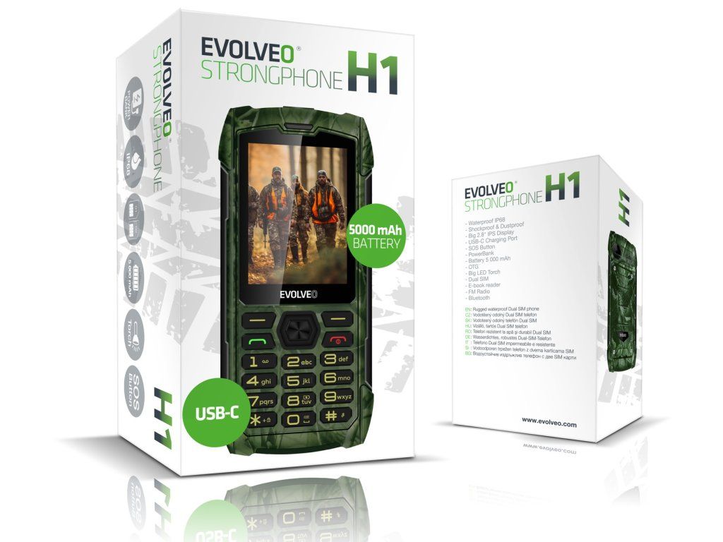 • EVOLVEO StrongPhone H1, vodotěsný odolný Dual SIM telefon, černá-stříbrná (PartNo SGP-H1-BS) • EVOLVEO StrongPhone H1, vodotěsný odolný Dual SIM telefon, černá-šedá (PartNo SGP-H1-BG) • EVOLVEO StrongPhone H1, vodotěsný odolný Dual SIM telefon, oranžová (PartNo SGP-H1-OR) • EVOLVEO StrongPhone H1, vodotěsný odolný Dual SIM telefon, lovecká kamufláž (PartNo SGP-H1-HNT)PŘÍPLATKOVÉ PŘÍSLUŠENSTVÍ: