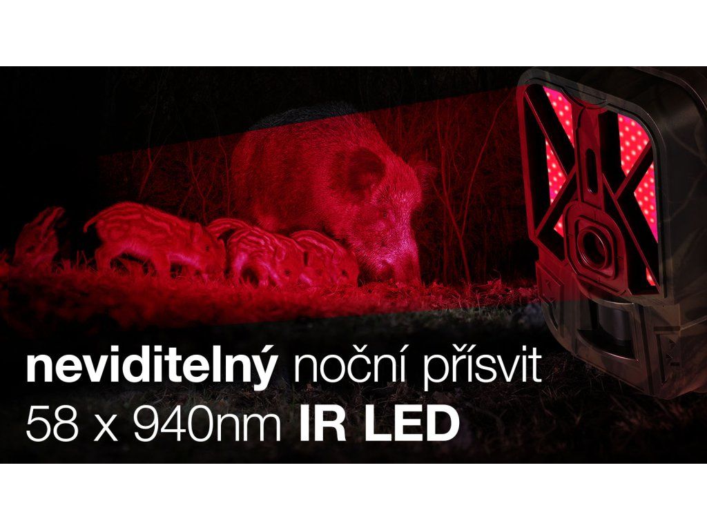Infra noční přísvit je důležitá funkce každé fotopasti, díky 940nm LED diodám lze zařízení použít nejenom pro sledování zvěře, ale i k ostraze objektů, kdy narušitel není schopný v noci tento typ přísvitu pozorovat, na rozdíl od 850nm technologie. Díky 58 IR LED diodám s 940nm technologií dojde k velice dobrému osvětlení noční scény.Příslušenství pro bezstarostný provoz