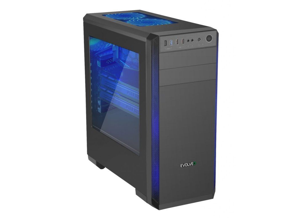 Počítačová skříň formátu ATX určená pro základní desky podporující platformu Intel i AMD. Mimo formátu ATX je kompatibilní i s formátem Micro ATX. Napájecí zdroj se umísťuje do dolní části skříně a mřížka je osazena prachovým filtrem. Skříň má průhlednou bočnici. Základní specifikace • 1x 5.25'' externí • 1x 5.25'' interní • 2x 3.5'' interní • 3x 2,5 '' SSD (nebo 5x společně s 3.5'') • maximální délka VGA karty: 400 mm • maximální výška CPU chladiče: 163 mm Rozšiřující sloty • 7x PCI slot Přední I/O Porty • 2x USB2.0 • 1x USB3.0 Ventilátory • 2x 120 mm nebo 2x 140 mm, přední • 2x 120 mm LED modrý, horní - instalovaný • 1x 120 mm LED modrý, zadní - instalovaný Rozměry • 455 x 205 x 482 mm K produktu je možno dokoupit EVOLVEO LED ventilátory různých rozměrů a barev.Dodatočné parametre