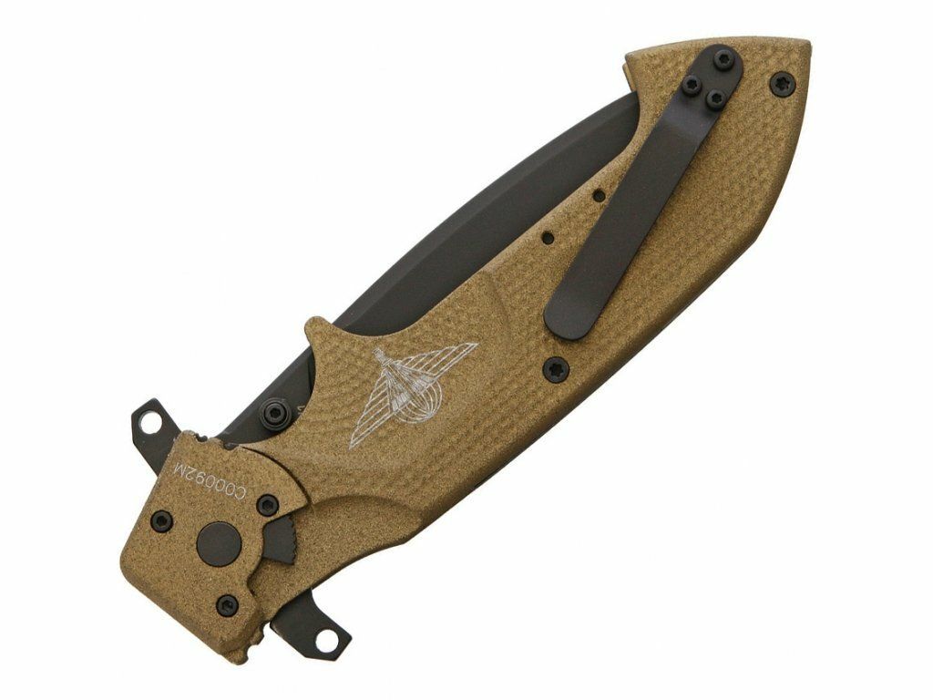 Rukoväť je z eloxovaného hliníka púštnej hnedej farby, v spodnej časti má hrot na rozbíjanie skla a výklopný rezač pásov. So sponou na vrecká.