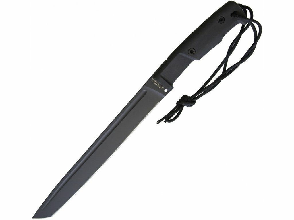 Má dlhú čepeľ s hladkou hranou z ocele Bohler N690 s čiernym povrchom.