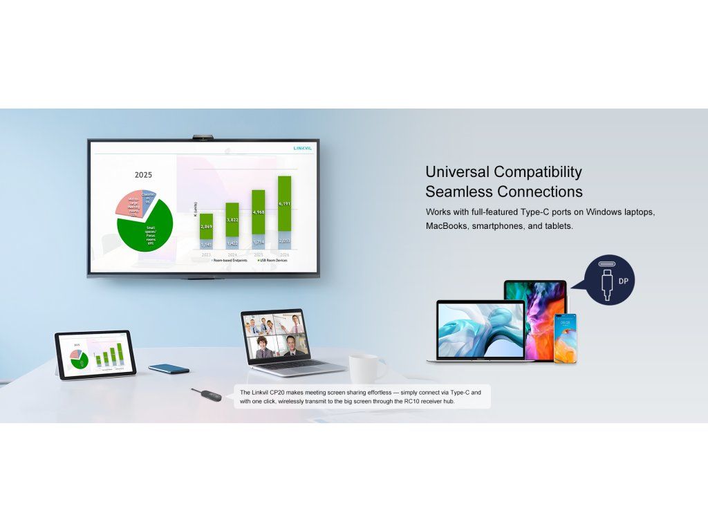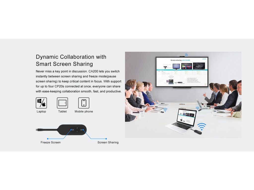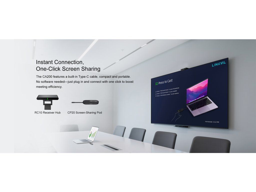 Linkvil CA200 je bezdrátová konferenční sada navržená pro zjednodušení nasazení a zvýšení efektivity schůzek. Díky integrovanému vysílači a přijímači může jeden rozbočovač CA200 současně připojit až čtyři pody pro sdílení obrazovky CP20 – není nutná žádná systémová integrace. Stačí jej zapojit a můžete začít s ním pracovat. Podporuje bezdrátové vysílání v rozlišení 4K a umožňuje bezproblémové přepínání do režimu zmrazení, což umožňuje plynulé prezentace a flexibilní spolupráci v různých scénářích. CA200 je kompaktní a přenosná, kompatibilní s více zařízeními, což pomáhá eliminovat nepořádek s kabely a vytvořit čistší a produktivnější prostředí pro schůzky. Okamžité připojení, sdílení obrazovky jedním kliknutím CA200 je vybaven vestavěným kabelem typu C, je kompaktní a přenosný. Není potřeba žádný software – stačí zapojit a jedním kliknutím se připojit, čímž zvýšíte efektivitu schůzek. Jednoduché nastavení ve 3 krocích Není nutné žádné školení. Rychlé nastavení a jednoduchá údržba vás zbaví zdlouhavého učení a složitých úprav. Zažijte každý detail v rozlišení 4K Ultra HD Díky ultračistému rozlišení 4K/30 fps odhalí CA200 každý detail s ohromující ostrostí. Od datových grafů a návrhů po video prezentace – užijte si pohlcující vizuální zážitek. Dynamická spolupráce díky inteligentnímu sdílení obrazovky Nikdy nezmeškejte žádný důležitý bod diskuse. CA200 vám umožňuje okamžitě přepínat mezi sdílením obrazovky a režimem zmrazení (pozastavení sdílení obrazovky), abyste se mohli soustředit na důležité obsahy. Díky podpoře až čtyř připojených zařízení CP20 najednou může každý snadno sdílet své obsahy, což zajišťuje plynulou, rychlou a produktivní spolupráci. Univerzální kompatibilita, hladké připojení Funguje s plně vybavenými porty Type-C na noteboocích s Windows, MacBook, smartphonech a tabletech. Klíčové parametry - Až 4K/30 snímků za sekundu s nízkou latencí - Zabezpečení: Šifrování dat WPA3 - IFPD: Podpora zpětného ovládání - Sdílení pracovní plochy: Zrcadlení a rozšířený režim - Sdílení z více zařízení: Až 4 zařízení Wi-Fi: Wi-Fi 5/Wi-Fi 6 - Frekvenční pásmo: 2,4 GHz/5 GHz - Šifrovací protokol: WPA3-PSK - Přenosová vzdálenost: až 10 metrůDodatočné parametre