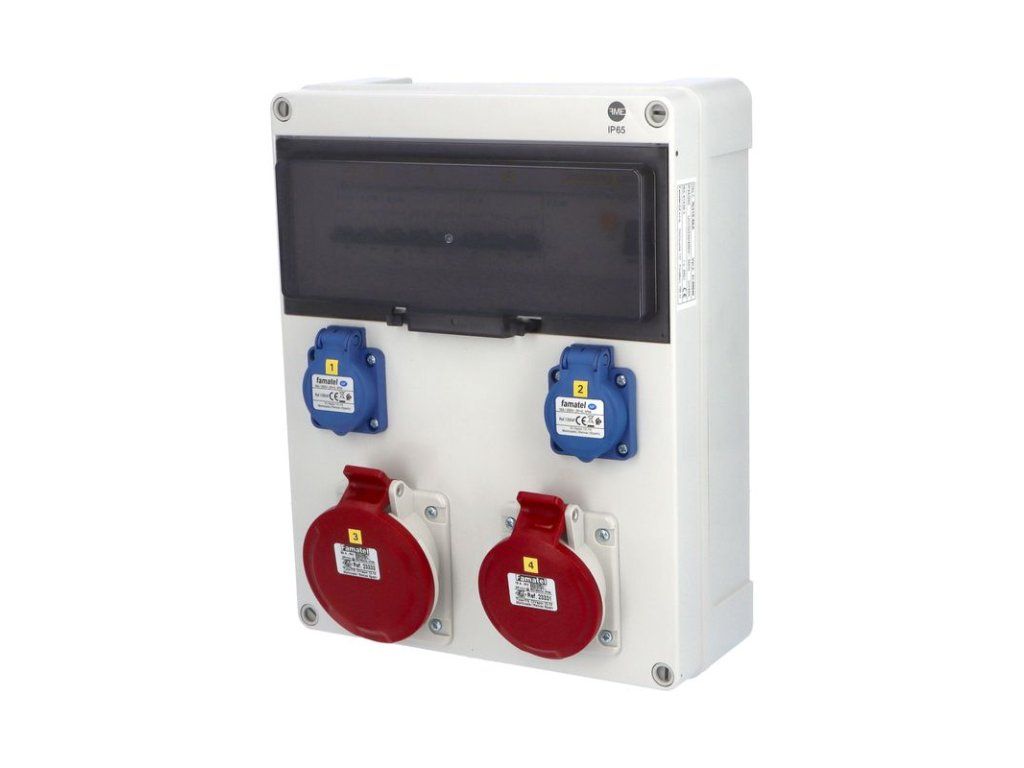 Zásuvková skříň FAMATEL fb310-6kA - ZSF20101000.1 /5813 IP54 jištěná s chráničem 40/4/003, zásuvky 2x230V, 1x16/5, 1x32/5, přístroje EATON 6kA: 2xPL6-B16/1, 1xPL6-B16/3, 1xPL6-B32/3, PF6-40/4/003 na vstupu, použité pouzdro: 5813 - 340x270x120mm, barva: světle šedá. Zásuvková skříň (rozváděč nízkého napětí) fb310-6kA - ZSF20101000.1 /5813 IP54 jištěná s chráničem 40/4/003, zásuvky 2x230V/16A (s ochranným kolíkem dle ČSN), 1x400V/16A/5pól, 1x400V/32A/5pól, jistící přístroje EATON 6kA: 2xPL6-B16/1, 1xPL6-B16/3, 1xPL6-B32/3, PF6-40/4/003 na vstupu (citlivost na reziduální proud 30mA), použité pouzdro: 5813 - celkem k dispozici 13mod. míst, rozměry: 340x270x120mm, plastová, materiál ABS, IK08, zkouška žhavou smyčkou 650°C, bezhalogenová a UV odolná, montáž na povrch, barva: světle šedá, aplikované normy: IEC 61439-3 (Rozváděče nízkého napětí - Část 3: Rozvodnice určené k provozování laiky (DBO), balení: 1ks (fólie), zásuvky na 230V/16A s ochranným kolíkem dle ČSN, polykarbonátové okénko, jistící prvky EATON, PE svorkovice součástí, N svorkovice součástí, hladké stěny pro volitelné vyvrtání vstupního otvoru a následné osazení příslušnou vývodkou (pro CYKY 5x6; 4x10; 5x10 => M25; pro CYKY 5x16 => M32), max. připojitelný vstupní kabel = 4x25 nebo 5x16 (Cu), dodáno s průvodní dokumentací: štítkem rozváděče, návodem pro obsluhu a montáž, krycím listem (charakteristiky rozhraní), protokolem o kusové zkoušce, ES prohlášením o shodě, schématem zapojení a zkouškou oteplení pro rozváděče nízkého napětí. Pro montáž na hořlavé podklady je nutné použít nehořlavou podložku.Recyklační poplatek je zahrnut v ceně výrobku.