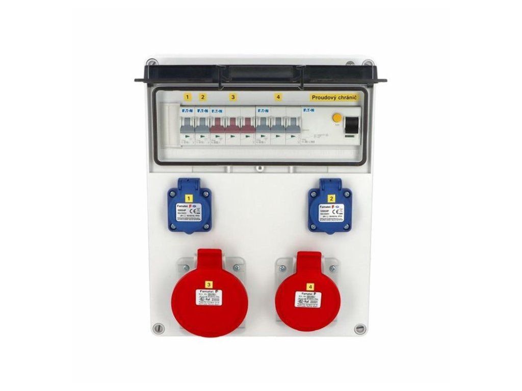 Zásuvková skříň FAMATEL fb310 - ZSF20101000.1 /5813 IP54 jištěná s chráničem 40/4/003, zásuvky 2x230V, 1x16/5, 1x32/5, přístroje EATON 10kA: 2xPL7-B16/1, 1xPL7-B16/3, 1xPL7-B32/3, PF7-40/4/003 na vstupu, použité pouzdro: 5813 - 340x270x120mm, barva: světle šedá. Zásuvková skříň (rozváděč nízkého napětí) fb310 - ZSF20101000.1 /5813 IP54 jištěná s chráničem 40/4/003, zásuvky 2x230V/16A (s ochranným kolíkem dle ČSN), 1x400V/16A/5pól, 1x400V/32A/5pól, jistící přístroje EATON 10kA: 2xPL7-B16/1, 1xPL7-B16/3, 1xPL7-B32/3, PF7-40/4/003 na vstupu (citlivost na reziduální proud 30mA), použité pouzdro: 5813 - celkem k dispozici 13mod. míst, rozměry: 340x270x120mm, plastová, materiál ABS, IK08, zkouška žhavou smyčkou 650°C, bezhalogenová a UV odolná, montáž na povrch, barva: světle šedá, aplikované normy: IEC 61439-3 (Rozváděče nízkého napětí - Část 3: Rozvodnice určené k provozování laiky (DBO), balení: 1ks (fólie), zásuvky na 230V/16A s ochranným kolíkem dle ČSN, polykarbonátové okénko, jistící prvky EATON, PE svorkovice součástí, N svorkovice součástí, hladké stěny pro volitelné vyvrtání vstupního otvoru a následné osazení příslušnou vývodkou (pro CYKY 5x6; 4x10; 5x10 => M25; pro CYKY 5x16 => M32), max. připojitelný vstupní kabel = 4x25 nebo 5x16 (Cu), dodáno s průvodní dokumentací: štítkem rozváděče, návodem pro obsluhu a montáž, krycím listem (charakteristiky rozhraní), protokolem o kusové zkoušce, ES prohlášením o shodě, schématem zapojení a zkouškou oteplení pro rozváděče nízkého napětí. Pro montáž na hořlavé podklady je nutné použít nehořlavou podložku.