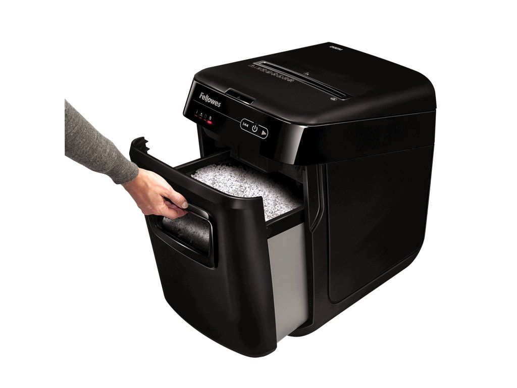 Skartování nikdy nebylo snazší. Revoluční novinka značky Fellowes, Vás o tom přesvědčí. Jen nalož, zapni a běž. Tento automatický skartovací stroj Vám umožní věnovat se prospěšnějším kancelářským činnostem, nežli je opakované postávání u běžného skartovače. Zařízení je schopno na jeden pracovní cyklus při automatickém podávání skartovat až 200 listů 70g papíru v mikrořezu 2×14 mm. Skartovač je vybaven vstupní štěrbinou pro ruční podání až 9-ti listů papíru. (vstup 220 mm pro ruční podání papíru). Výkonný řezací mechanismus zpracuje při automatickém podávání sešívačkou sešité papíry. Při manuálním podávání i kreditní karty. Stupeň utajení dle NBÚ – tajné. Ovládání je zajištěno prostřednictvím dotykového panelu s LED podsvětlením. Samozřejmostí je indikace přehřátí, otevřeného zásobníku, plného odpadního koše i případného kolizního stavu (pokud je na vstupu nežádoucí obsah). Délka nepřetržitého pracovního cyklu 12 min. Automatický ochranný systém proti přehřátí. Podstava s kolečky pro pojezd. Řezné nože ze speciální tvrzené oceli, silný motor a kovové převodové součásti předurčují AutoMax pro dlouhodobé a bezproblémové využití. Skartovač je vybaven řadou pokročilých funkcí, které usnadňují jeho obsluhu a užívání: Autofeed - automatické podávání papíru pro střední a vyšší zátěž, šetří čas strávený podáváním papíru. System „accufeed“ – automatické podávání papíru pro střední zátěž, šetří čas strávený podáváním papíru Funkce „SilentShred“ výrazně minimalizuje zatížení hlukem při skartování Auto-Reverse™ – zajistí přerušení skartace a zpětný chod při záseku Funkce „Sleep MODE“ – automatické vypnutí stroje po 2 minutách nečinnosti Systém MICROSHRED - rozřeže papír formátu A4 na více jak 2000 částeček. PARAMETRY: • Typ řezu: křížový řez • Typ řezu: mikrořez • Automatický skartovač: ano • Velikost odpadu po skartaci: 2 x 14 mm • Kapacita skartace z automatického zásobníku: 200 listů / 70g papíru • Doba pro skartaci plného zásobníku: 12 min • Skartovací kapacita: 8 listů / 70g papíru • Mikrořez: ano • Objem koše: 32 L • Objem koše ve skartovaném papíru: 400 listů / 80g papíru • Doporučený počet uživatelů: 1 - 3 osob • Vstupní šířka: 230 mm • Skartuje také: CD | karty | spony: ne | ano | ano • Hlučnost: 65 dB • Stupeň utajení dle NBÚ: NNI 2 • Certifikováno NBÚ: ano • Stupeň utajení dle DIN 66399: P - 5 • Doba nepřetržité skartace: 20 min • Příkon: 460 W • Napájení: 230 V • Rozměry (Š x V x H): 345mm x 545mm x 515mm • Hmotnost: 15.7 kgDodatočné parametre