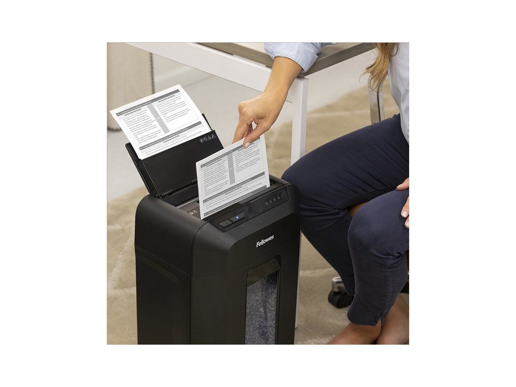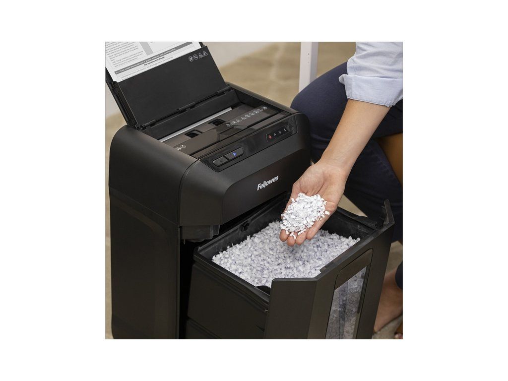 Vstupní model z řady automatických skartovačů značky Fellowes určený pro jednoho uživatele jako osobní skartovač v kanceláři. Jen nalož, zapni a běž. Automatický skartovací stroj Vám šetří čas strávený vkládáním skartovaných papírů. Zařízení je schopno na jeden pracovní cyklus při automatickém podávání skartovat až 90 listů 70g papíru v křížovém mikrořezu řezu 4×12 mm. Skartovač je také vybaven vstupní štěrbinou pro ruční podání až 9 listů papíru. Skartace z manuálního podavače je možná souběžně se skartací ze zásobníku automatického podávání. Objem odpadního koše 17 litrů. Snadná manipulace se strojem díky pojezdovým kolečkům. Ovládání je zajištěno prostřednictvím dotykového panelu s LED podsvětlením. Samozřejmostí je indikace přehřátí a plného odpadního koše. Automatický ochranný systém proti přehřátí. Maximální délka nepřetržitého pracovního cyklu 10 min. Řezné nože ze speciální tvrzené oceli, silný motor a robustní převodové součásti předurčují AutoMax pro dlouhodobé a bezproblémové využití. Vysouvací odpadní nádoba uvnitř pro snadnou manipulaci. Elegantní a praktické řešení sklápěcího automatického podavače. Skartovač je vybaven dalšími pokročilými funkcemi, které usnadňují jeho obsluhu a užívání: Auto-Reverse™ – zajistí přerušení skartace a zpětný chod při záseku Funkce „Sleep MODE“ – automatické vypnutí stroje po 2 minutách nečinnosti • Kapacita zásobníku : 90 listů / 70g papíru • Skartovací kapacita při ručním podání : 9 listů / 70g papíru • Typ řezu : 4x12 mm • Stupeň utajení dle NBÚ do 31.12.2022 : typ 2 – důvěrné • Stupeň utajení dle NBÚ od 1.1.2023 : NNI 1 • Šířka vstupu : 220 mm • Skartace spon ze sešívačky : ano • Skartace kancelářských spon : ano • Skartace kreditních karet : ano • Skartace CD : ne • Délka nepřetržitého pracovního cyklu : 10 minut • Objem koše : 17 litrů - vysouvací odpadní koš pro snadnou manipulaci • Rozměry (Š x H x V) : 340 x 515 x 245 mm • Hmotnost : 8,9 kg • Napájení : 230–240 V/ 50HzDodatočné parametre