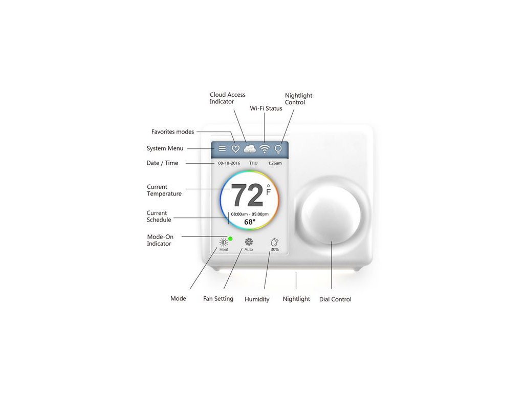 Termostaty pôsobia ako nepriame ovládacie prvky pre prístup k systému HVAC (vykurovanie, vetranie, klimatizácia). Prístroj nie je priamo ohrievaný, ochladzovaný ani vetraný. Riadi iba relé alebo vysiela signál pre aktiváciu systému. Najdôležitejšou funkciou termostatu je zistenie teploty v miestnosti a optimalizácia dennej teploty podľa koncového používateľa. Celé rozhranie je veľmi jednoduché a intuitívne. Môžeme riadiť termostat zo vstavanej prednej časti displeja. Po nainštalovaní aplikácií, ktoré sú k dispozícii v Obchode Google Play (Android) a AppSore (iOS), budeme ho môcť ovládať odkiaľkoľvek prostredníctvom smartfónu (za predpokladu, že majú prístup na Internet). Pri návšteve účtu account.ferguson.com.pl a prihlásení k rovnakému účtu ako v termostate získavame možnosť ovládať zariadenie prostredníctvom webového prehliadača. Termostat umožňuje riadiť systémy ako kúrenie, klimatizácia alebo vetranie.