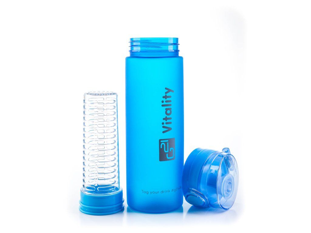 Modrá fľaša G21 na smoothie/juice v mrazivom dizajne je vyrobená z odolného a nezávadného tritanu. Má objem 600 ml a je to praktický parťák nielen na doma, ale aj do prírody alebo na šport. Navyše obsahuje plastové vkladacie sitko na lúhovanie byliniek, kúskov ovocia alebo čajov.
