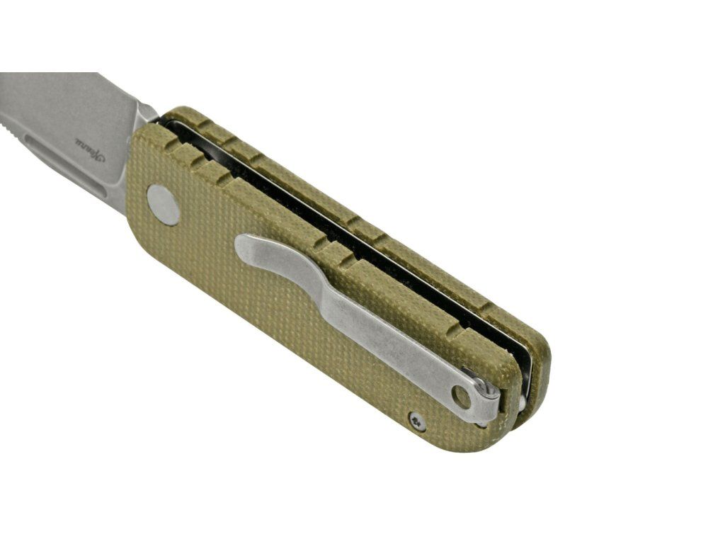 Plochá rukoväť je z materiálu Micarta zelenej farby, s jemnou textúrou pre pohodlné uchopenie. So sponou na vrecká.
