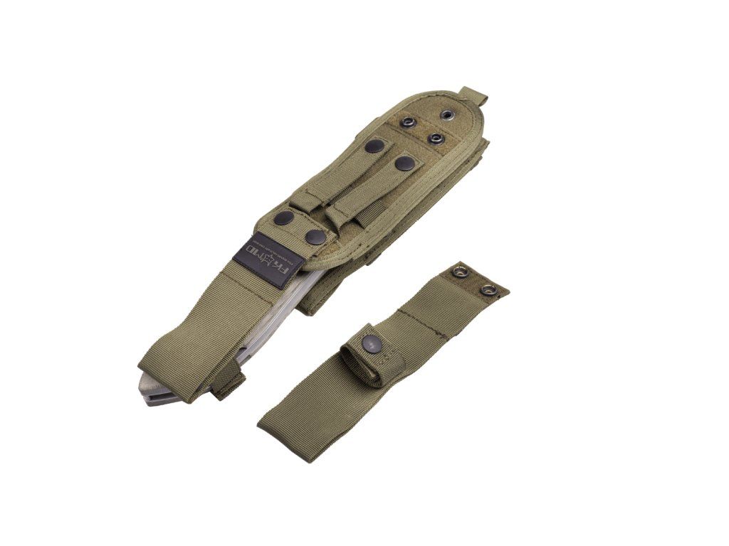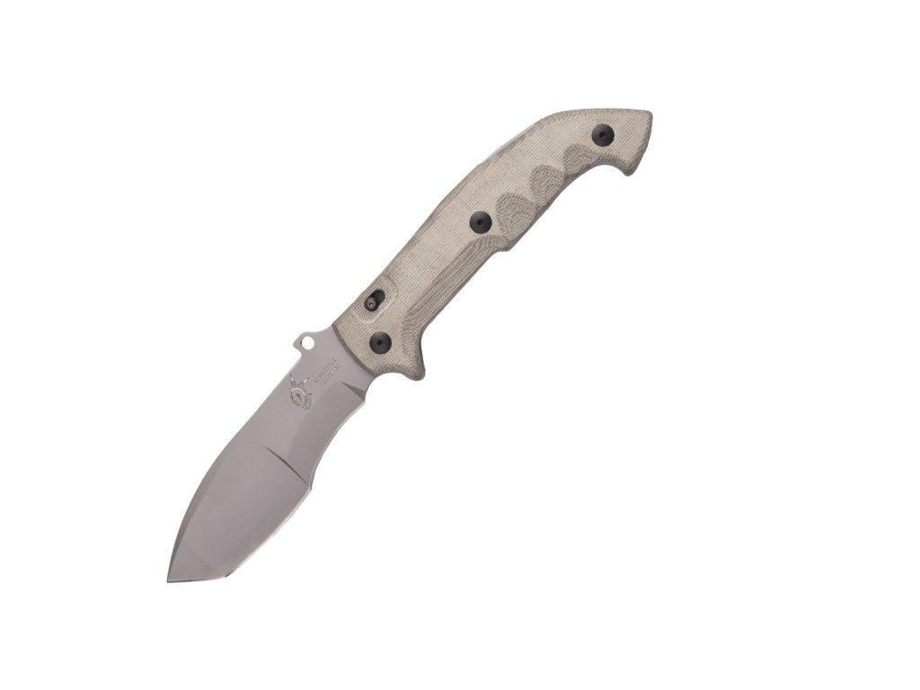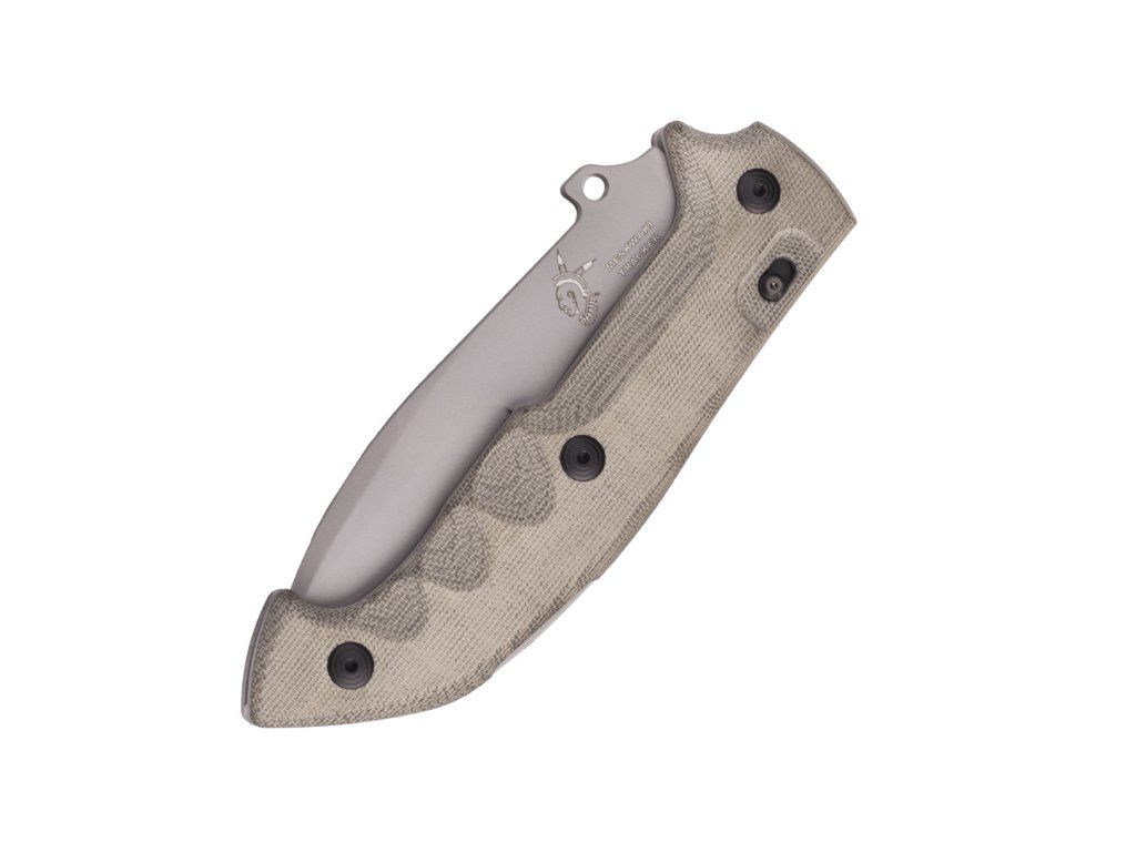 Tvarovaná rukoväť je z odolného materiálu Micarta zelenej farby, s textúrovaným povrchom pre pohodlné uchopenie. V spodnej časti má otvor na šnúrku.