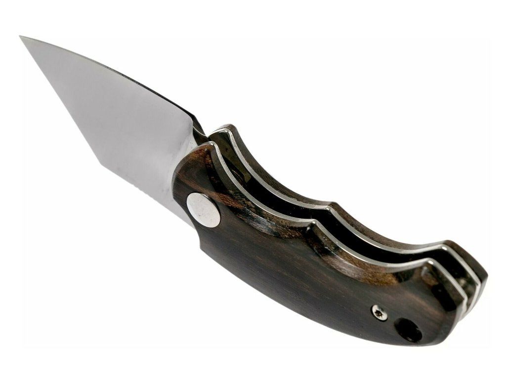 S čepeľou s hladkou hranou z nerezovej ocele s kobaltom N690Co so saténovým povrchom, otvára sa pákovým mechanizmom Friction, nemá poistku. V otvorenej pozícií ju drží iba tlak ruky alebo palca na páku.