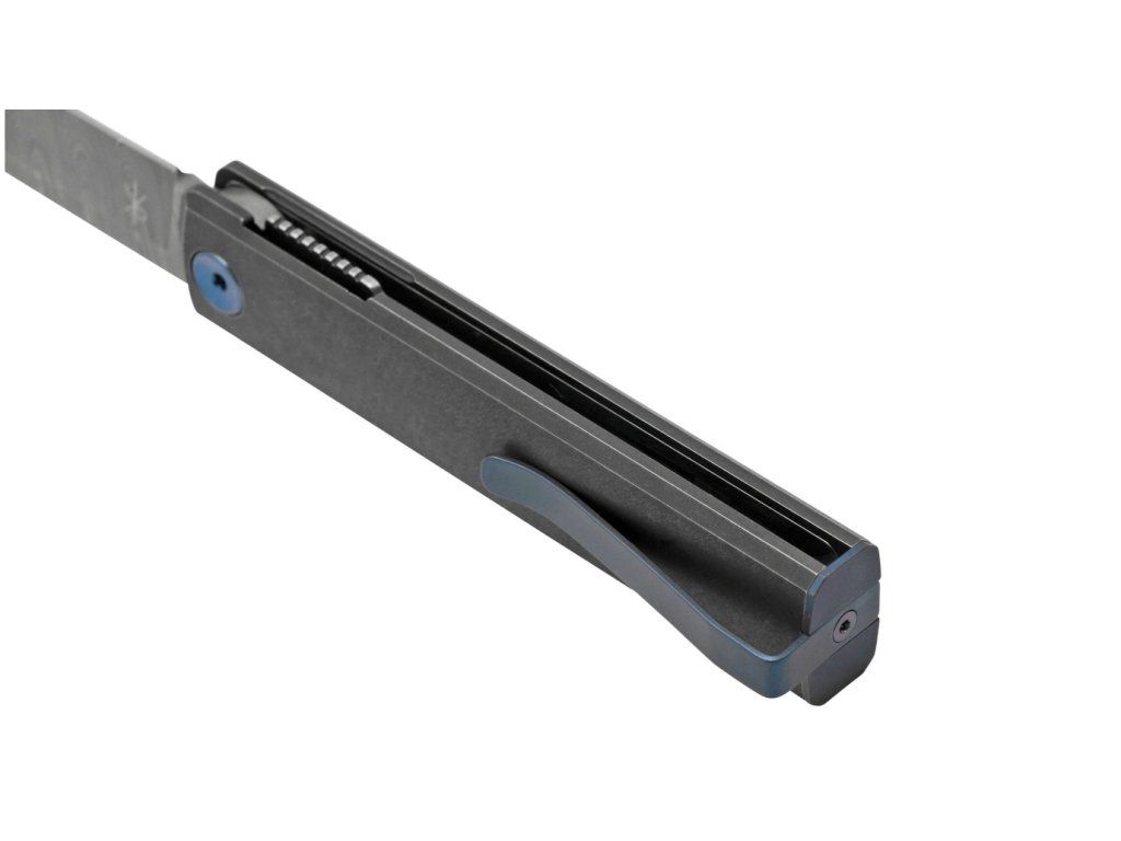 S rukoväťou z titánu s povrchom PVD Stonewash, s vložkami z titánu modro-fialovej farby, so sponou na vrecká.