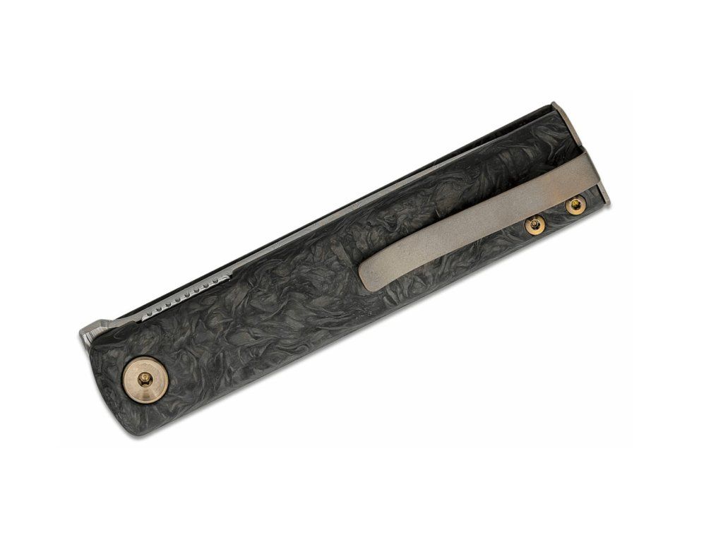 S rukoväťou z uhlíkových vlákien s bronzovou titánovou rozperou, ktorá dodáva decentný farebný kontrast. S titánovou sponou na vrecká.