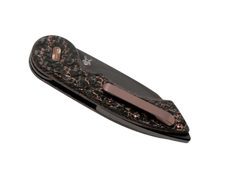 Rukoväť je z kombinácie uhlíkových vláken a medi a pripomína hadiu kožu, s vložkami z ružového anodizovaného titánu. So sponou na vrecká.