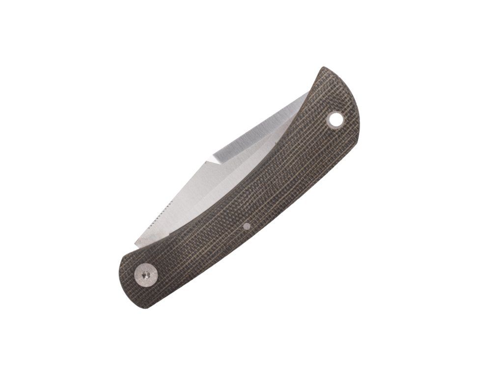 S tvarovanou rukoväťou z materiálu Micarta zelenej farby, s dierkou na šnúrku, bez spony.