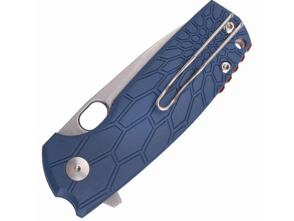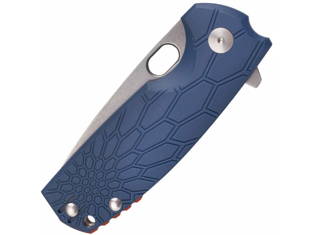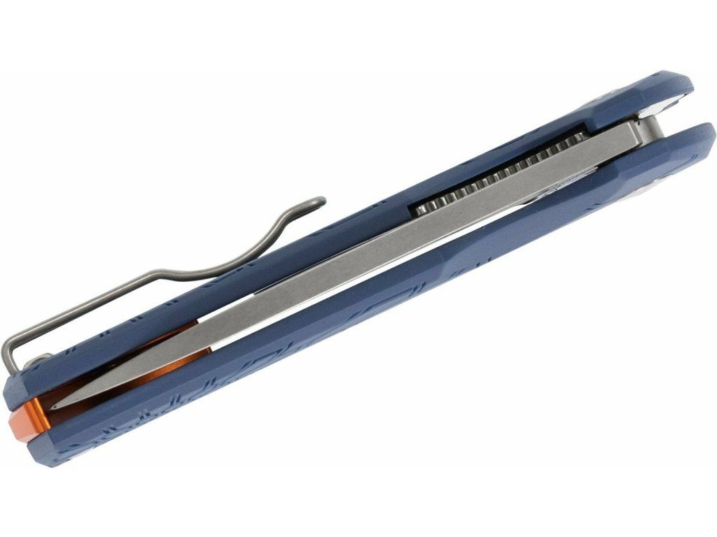 Rukoväť je z modrého protišmykového materiálu FRN, s otvorom na šnúrku .Do zadnej strany rúčky je vložená oranžová, spevňovacia vložka. Nôž má sponu na vrecká.