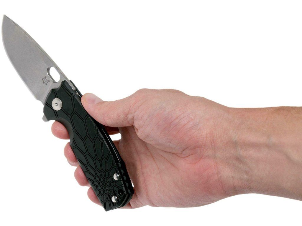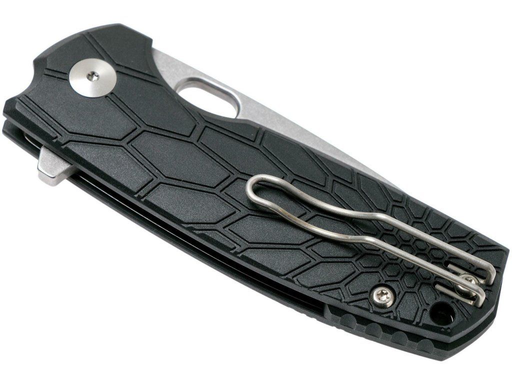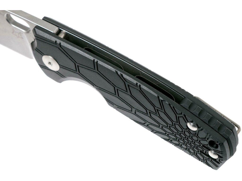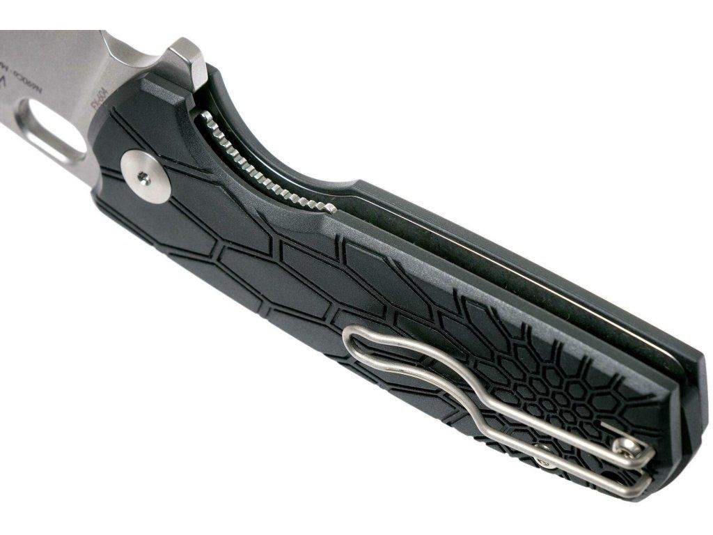 Rukoväť je z čierneho protišmykového materiálu FRN, s otvorom na šnúrku. Nôž má sponu na vrecká.