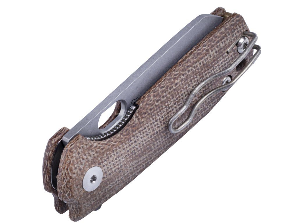 S čepeľou s hladkou hranou z nerezovej ocele M390 s povrchom Acid Stonewash, otvára sa palcovým otvorom v čepeli alebo vyklápačom Flipper, zaisťuje ju poistka Linerlock.