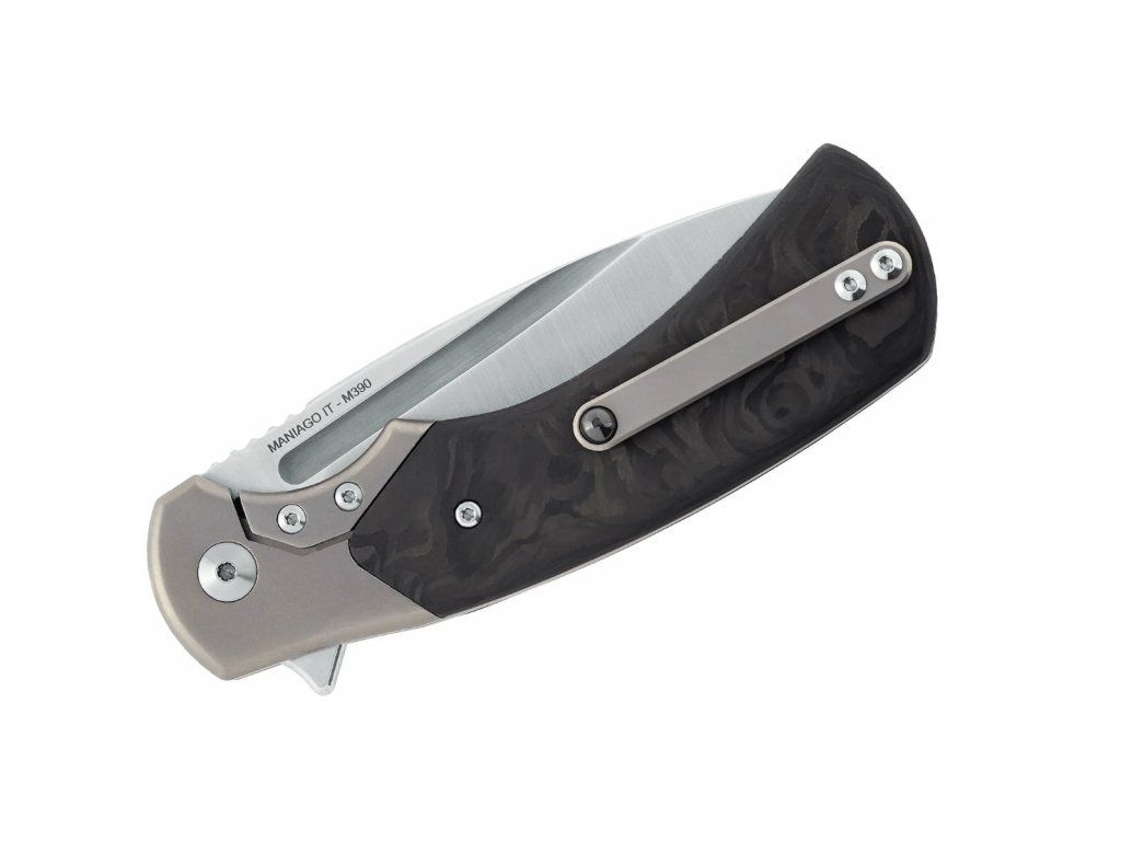 S čepeľou s hladkou hranu typu Drop Point z prémiovej ocele M390 so saténovou povrchovou úpravou, otvára sa vyklápačom Flipper a zaisťuje ju Framelock.