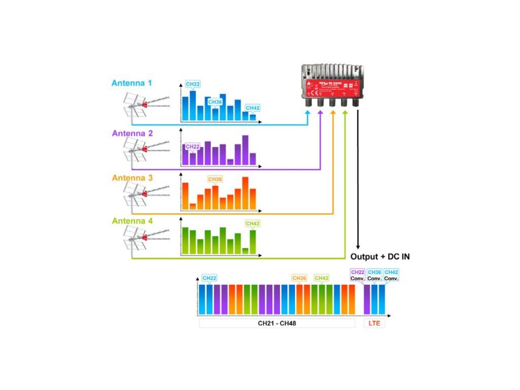 Jedná se o inteligentní stožárový zesilovač se 4 vstupy VHF/UHF, které jsou konfigurovány podle vstupních kanálů, a jedním výstupem. Zesílení se samo nastavuje tak, aby poskytovalo maximální výstupní úroveň. Po připojení napájení vyhledává kanály ze všech vstupů na svých 32 filtrech. Nastavení přepínače D.C.S (Duplicate Channel Switch) před připojením napájení umožňuje změnit duplicitní kanál na vstupech s nižší úrovní na kanál od 49 do 69. V případě, že je kanál na vstupu nastaven na nižší úroveň, je možné jej přepnout na kanál od 49 do 69. Je zcela stíněný.