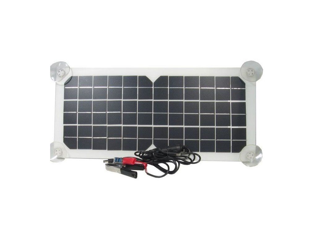 Flexibilný monokryštalický panel s výstupom 12V a USB na nabíjanie batérií, telefónov, powerbank a pod. Ideálne riešenie pre Vašu autobatériu v prípade dlhšej odstávky vozidla, kedy trvalo pripojené spotrebiče, ako je riadiaca jednotka, autorádio alebo diaľkové ovládanie dokážu vybiť štartovaciu batériu aj za týždeň. Priložený kábel zapojte do zásuvky 12V (nutné trvalé prepojenie s batériou, nie presklíček zapaľovania), panel umiestnite pomocou prísaviek za okno a Vašu batériu bude dodávaná potrebná energia pre kompenzáciu spotreby pripojených zariadení a samovybíjania. Panel je tiež možné využiť ako záložný zdroj na nabíjanie telefónov, powerbank a pod.