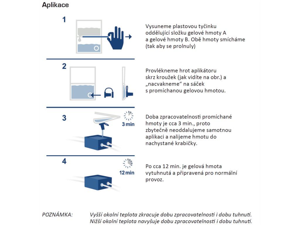Gel dvousložkový MPGEL-420 (0,42 litru - sáček), bez expirace, izolační zalévací gel, rozebíratelné spojení, barva: transparentní modrá, doba zpracovatelnosti: cca 3 minuty, doba tuhnutí: cca 12 minut.Dvousložkový zalévací gel - ETELEC MPGEL. Pro výplň a izolaci elektrických spojů. Rychle a jednoduše chrání spoj před nepříznivými přírodními vlivy jako je vlhkost, prach a další nečistoty. Složka gelu "A" i složka gelu "B" je průhledná hmota s nízkou viskozitou ("dobře teče") a po smíchání a vytuhnutí zůstává po celou dobu životnosti spoje rosolovitá. Při samotném vylévání krabičky nebo jiného média krásně zatéká do všech zákoutí. Spoj lze po vytuhnutí jednoduše rozebrat. Gel je šetrný k životnímu prostředí. Navíc nemá žadnou expiraci - můžete jej uchovávat/skladovat mít jej k použití kdykoliv bude potřeba.
