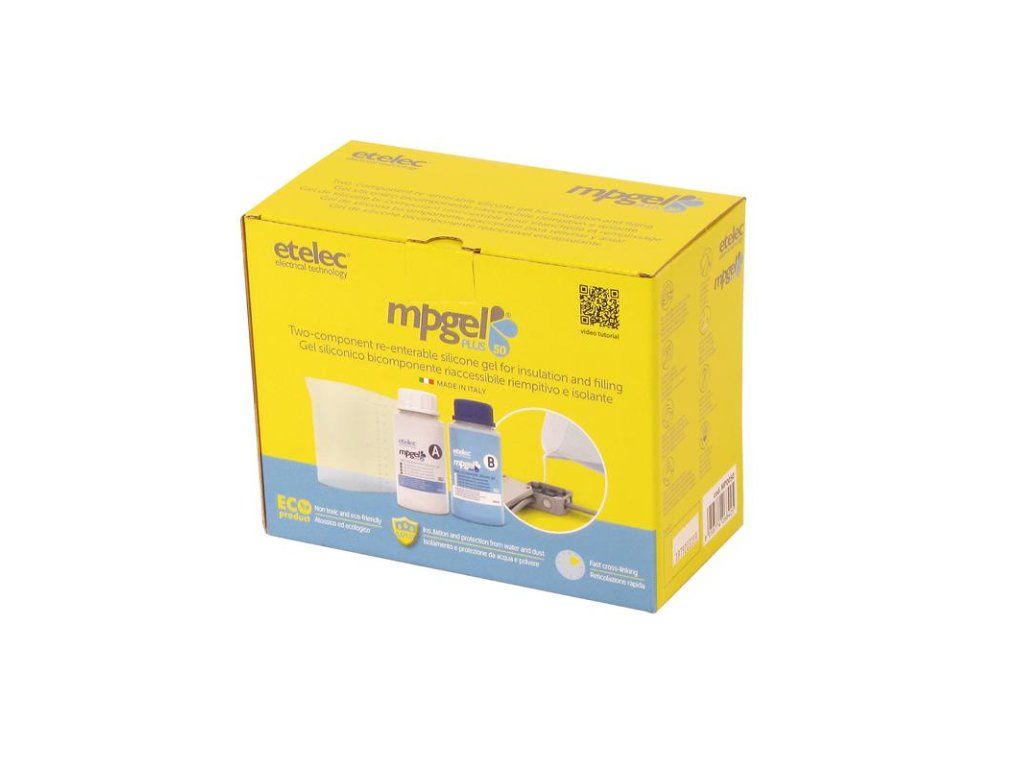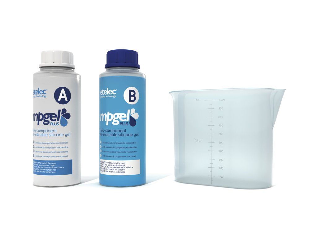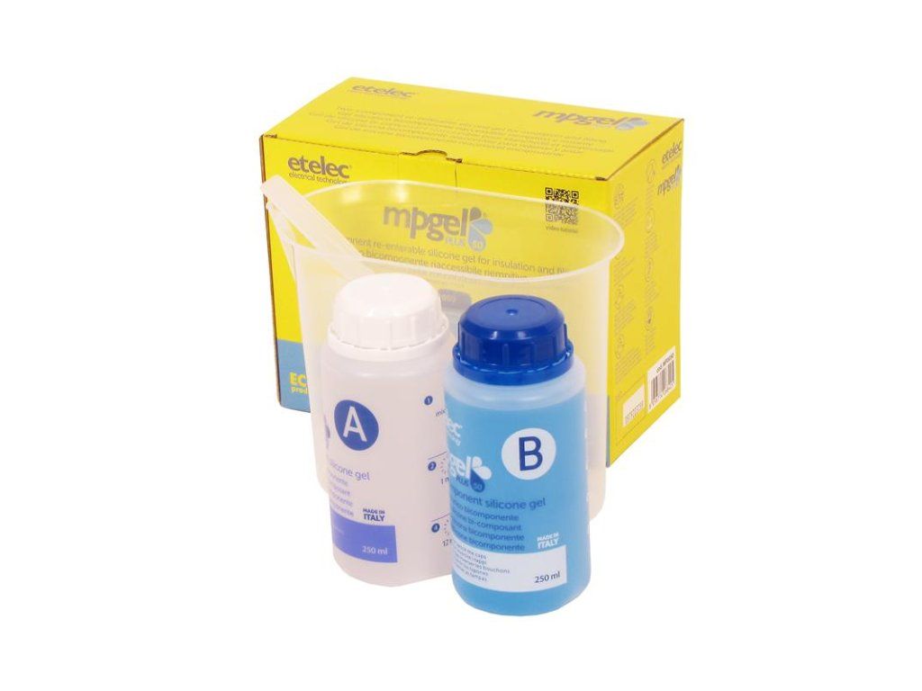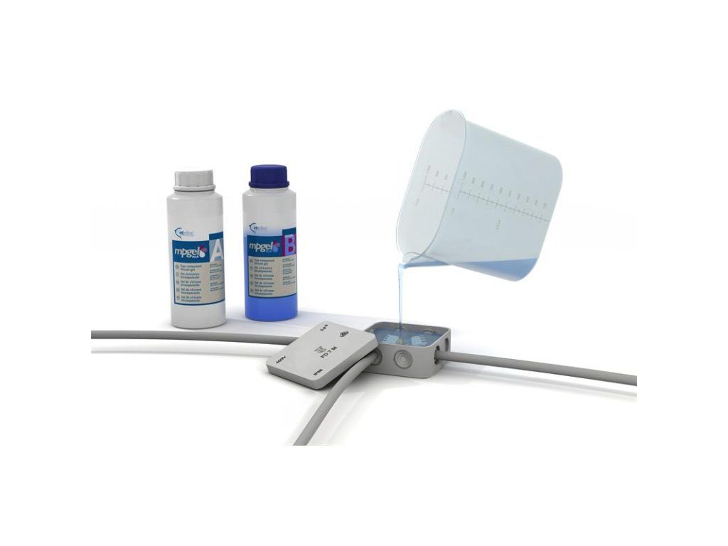 Gel dvousložkový MPGEL plus-50 (0,5 litru - 2x láhev 0,25l), bez expirace, izolační zalévací gel, rozebíratelné spojení, barva: transparentní modrá, doba zpracovatelnosti: cca 3 minuty, doba tuhnutí: cca 12 minut.Dvousložkový zalévací gel - ETELEC MPGEL. Pro výplň a izolaci elektrických spojů. Rychle a jednoduše chrání spoj před nepříznivými přírodními vlivy jako je vlhkost, prach a další nečistoty. Složka gelu "A" i složka gelu "B" je průhledná hmota s nízkou viskozitou ("dobře teče") a po smíchání a vytuhnutí zůstává po celou dobu životnosti spoje rosolovitá. Při samotném vylévání krabičky nebo jiného média krásně zatéká do všech zákoutí. Spoj lze po vytuhnutí jednoduše rozebrat. Gel je šetrný k životnímu prostředí. Navíc nemá žadnou expiraci - můžete jej uchovávat/skladovat mít jej k použití kdykoliv bude potřeba.