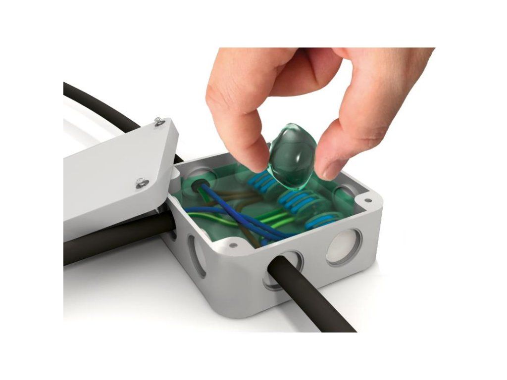 Dvě složky gelové hmoty smíchané v poměru 1:1 jsou ideální pro zalití elektrického spoje a to hlavně díky nízké viskozitě. (Po „vytuhnutí“ gelu zůstává hmota průhledná a „rosolovitá“, díky tomu zůstává spoj lehce rozebíratelný). Gel nemá žádnou expiraci.