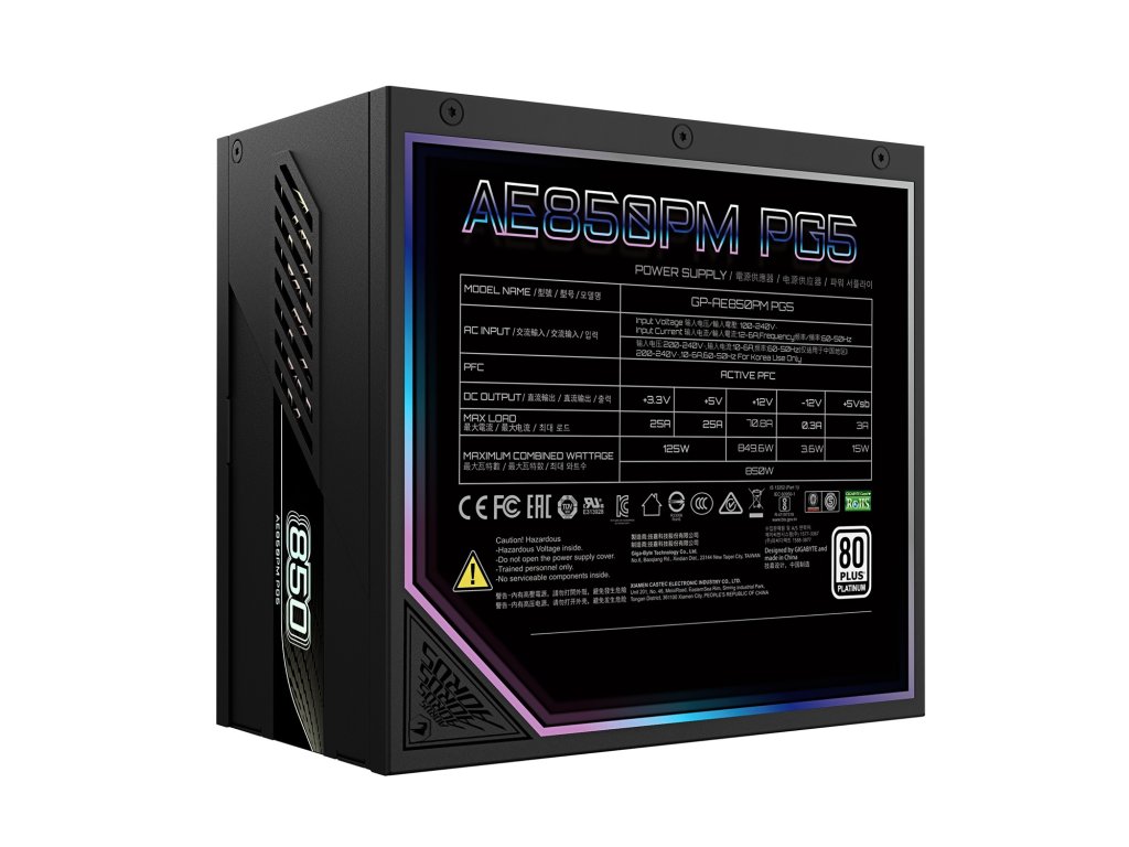 GIGABYTE AORUS ELITE P850W 80+ Platinum Modular PCIe 5.0 * vysoce kvalitní japonské kondenzátory * ochrana OVP/OPP/SCP/UVP/OCP/OTP * připraveno pro ATX 3.1 a PCIe Gen 5.0 * vysoce kvalitní nativní 16pinový kabel podporuje výkon 600W * certifikace 80 PLUS Platinum * plně modulární design * kompaktní provedení Typ: Intel Form Factor ATX 12V v3.1 PFC: aktivní Výkon: 850W Typ ventilátoru: 120mm ventilátor s fluidním dynamickým ložiskem (FDB) Účinnost: 92% při průměrné zátěži Vstupní proud: 12-6A Vstupní napětí: 100-240V AC (plný rozsah) Vstupní frekvence: 60-50Hz Konektory: * 1x ATX/MB 20+4 pin: 650 mm*1 * 2x CPU/EPS 4+4 pin: 700 mm*2 * 1x PCI-e 16 pin: 700 mm*1 * 6x PCI-e 6+2 pin: 650 mm+150 mm*2, 750 mm*2 * 8x SATA: 600 mm + 150 mm + 150 mm + 150 mm*2 * 4x 4 pin peripheral: 500 mm + 150 mm + 150 mm + 150 mm*1 Rozměry: 150x140x86mm Záruka: 10 let Odkaz na stránky výrobce: https://www.gigabyte.com/Power-Supply/GP-AE850PM-PG5-rev-11#kfDodatočné parametre