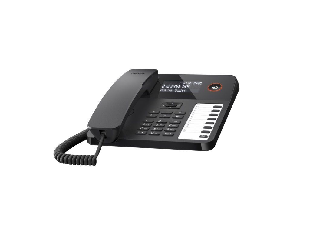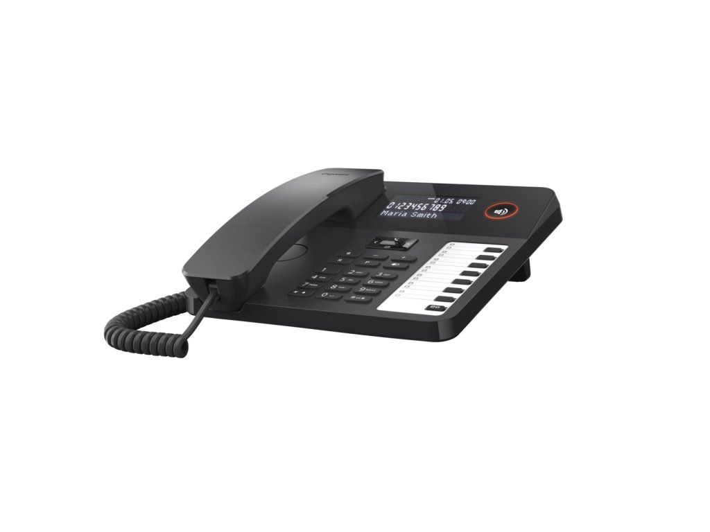 Šňůrový telefon na stůl a stěnu pro snadné telefonování *Velký LCD displej s LED podsvícením * Sedm kláves rychlé volby, každá se dvěma přiřazenými čísly * Funkce handsfree & připojení náhlavní soupravy přes RJ9 * Snadná možnost připevnění na stěnu * Adresář až na 100 záznamů včetně funkce VIP * Kompatibilní se sluchadly * Snadné ovládání přes 5směrnou navigační klávesu * Opětovné vytáčení * Signalizace hovorů pomocí 10 vyzváněcích tónů * Vhodný pro provoz s telefonními systémy Šňůrový telefon Gigaset DESK 600 s LCD displejem a sedmi klávesami přímé volby, každou se dvěma přiřazenými čísly, je ideální pro použití doma nebo v kanceláři. Velký LCD displej s podsvícením Gigaset DESK 600 má třířádkový LCD displej s LED podsvícením, jenž zobrazuje čas, jméno, číslo a VIP status (jeli přiřazen) volajícího. Domácí obrazovka poskytuje informace o datu, času a dni v týdnu. Funkce handsfree & připojení náhlavní soupravy Abyste měli volné ruce i v průběhu delších konverzací, je Gigaset DESK 600 vybaven funkcí handsfree se sedmi úrovněmi nastavení hlasitosti. Navíc je integrováno připojení náhlavní soupravy (RJ9), což umožňuje použití profesionálních náhlavních souprav. Sedm kláves přímé volby, každá se dvěma přiřazenými čísly Pomocí sedmi kláves přímé volby, každé se dvěma přiřazenými čísly, jsou důležité kontakty vzdálené jen na jedno stisknutí klávesy. To vám umožňuje rychlé spojení s lidmi, se kterými hovoříte často. Čísla přímé volby si můžete poznamenat na přiložené papírové vsádce, a tak je máte vždy na očích. Integrovaný adresář Integrovaný adresář nabízí prostor až na 100 telefonních čísel: to znamená, že všechny důležité kontakty jsou se svými jmény uloženy přímo na přístroji. Pomocí VIP statusu může být kontaktu přidělena jeho vlastní VIP melodie. Kromě toho můžete telefon nastavit tak, aby vyzváněl pouze pokud volají VIP kontakty – a u všech ostatních hovorů zůstal potichu. Obsah balení *1x stolní telefon *1x kabel k připojení náhlavní soupravy *1x napájecí jednotka *1x stojánek *1x telefonní kabel *1x stručná uživatelská příručkaDodatočné parametre