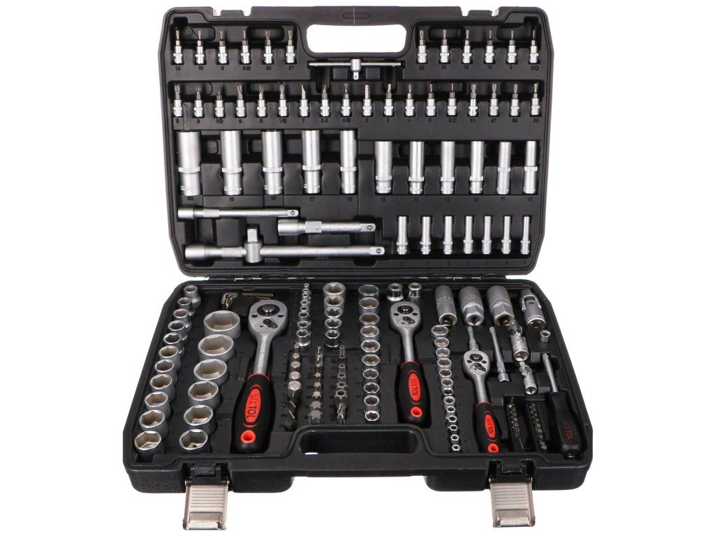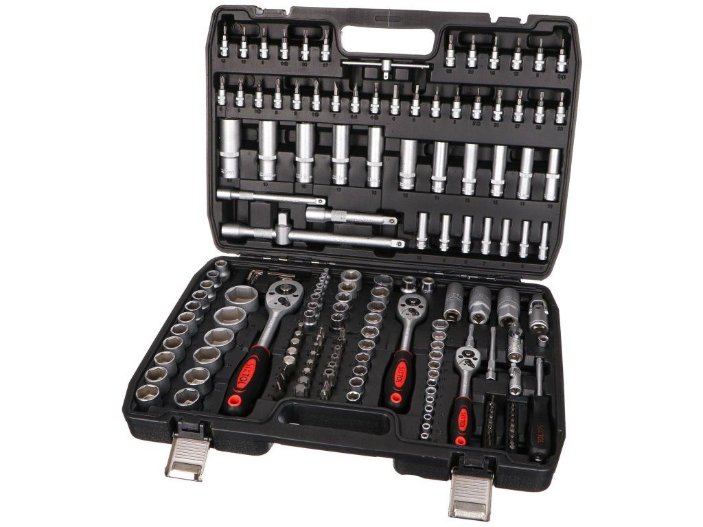 Kvalitní rozsáhlá gola sada se 171 díly hlavic a bitů všech velikostí a druhů s ráčnami v odolném plastovém kufru. Tato extra velká gola sada si najde místo v každé dílně nebo garáži. Obsahuje celou škálu nástrčných hlavic, zástrčných klíčů, bitů, tři ráčny, univerzální šroubovací rukojeť a další.Hlavní výhody: