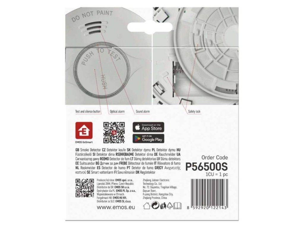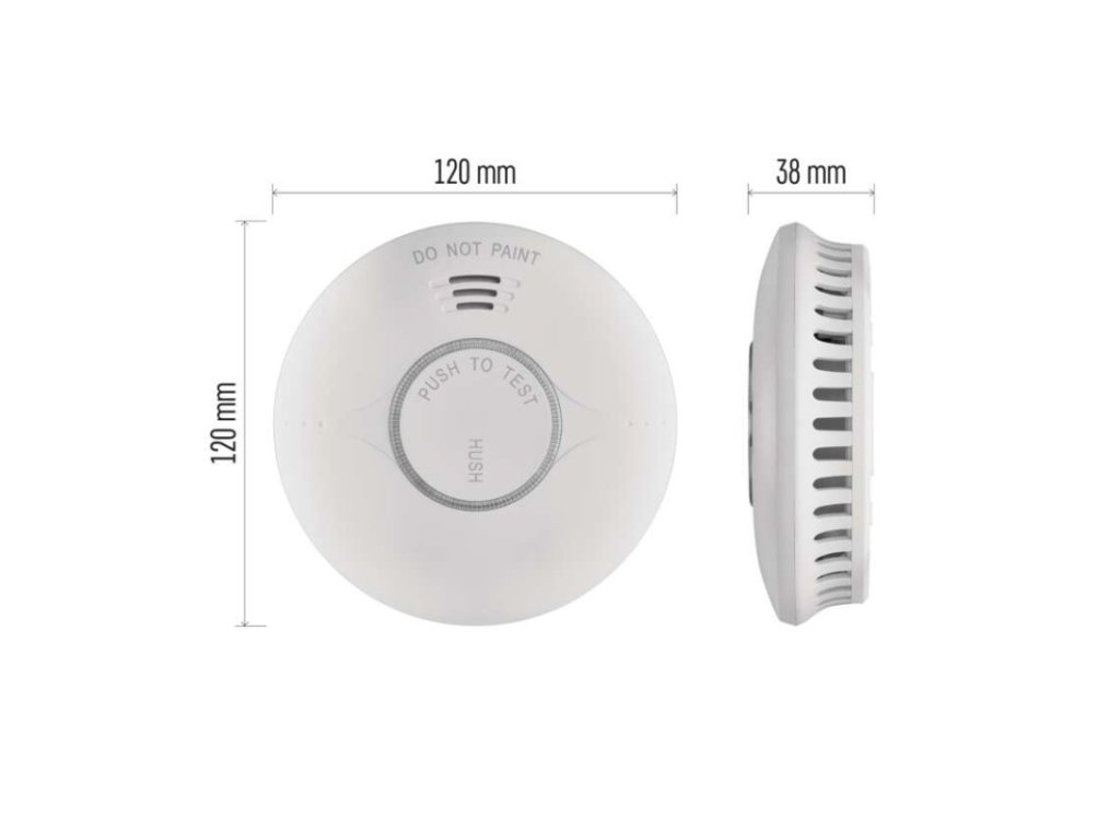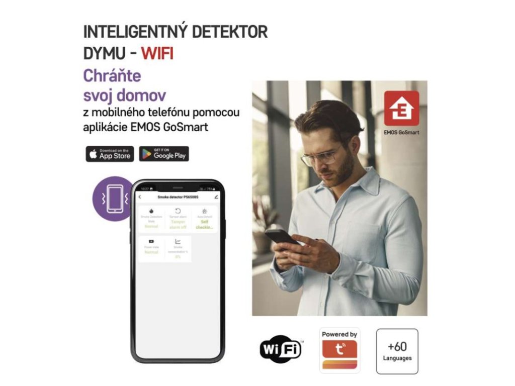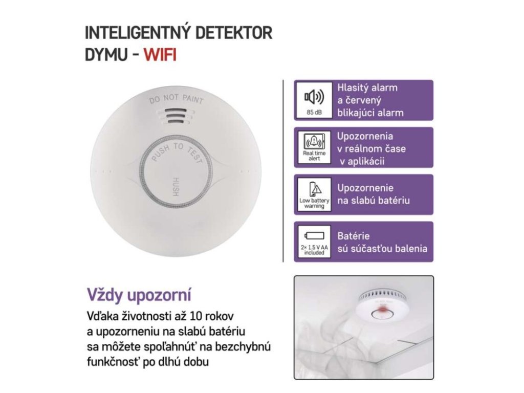 ďalšie funkcie: –|dosah modulu: neuvádza sa|hlasitosť signalizácie: >85 dB vo vzdialenosti 3 m|jazyky aplikácie: EN, CZ, SK, PL, DE, HU, SI, FR, + 60 ďalších jazykov|kompatibilita: EMOS GoSmart, TUYA, LIDL, Smartlife, otvorený systém|krytie: IP20|možnosť prepojenia s ďalšími detektormi: neuvádza sa|napájanie: 2× 1,5 V AA, súčasťou balenia|notifikácie do mobilnej aplikácie: áno|ovládanie hlasovými asistentmi: nie|pamäť poplachov: neuvádza sa|podporované OS: Android, iOS|poplachová teplota: –|predajný obal: 1 ks, krabička|prenosová frekvencia: 2,4 GHz WIFI (IEEE802.11b/g/n)|prevádzková teplota: 0 °C až 40 °C|prevádzková vlhkosť: 0–93 %|protokol: Wi-Fi|rozmer: 38 × 120 × 120 mm|typ detekcie: detektor dymu|typ inštalácie: montáž na stenu alebo voľne stojaci|typ signalizácie: optická aj zvuková|určené pre typ: neuvádza sa|životnosť: 10 rokovDodatočné parametre