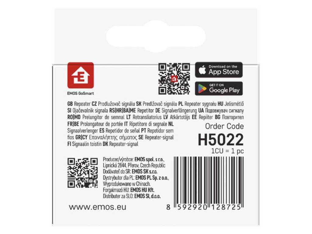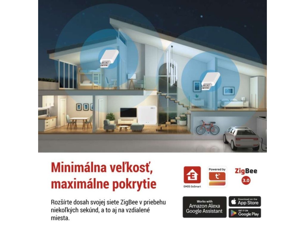 hĺbka: 38,85 mm|hmotnosť: 10 g|jazyky aplikácie: EN, CZ, SK, PL, DE, HU, SI, FR, + 60 ďalších jazykov|kompatibilita: EMOS GoSmart, TUYA, LIDL, Smartlife, otvorený systém|konektivita: 2,4 GHz (IEEE802.11b/g/n)|maximálny počet pripojených klientov: –|napájanie: 5 V DC/1,0 A|ovládanie hlasovými asistentmi: nie|párovanie: automatické, manuálne|počet ovládacích tlačidiel: –|podporované OS: Android, iOS|použitie: automatizácia|predajný obal: 1 ks, krabica|produkt: ZigBee repeater|protokol: Zigbee 3.0|šírka: 21,5 mm|výška: 8,5 mm|zdroj súčasťou balenia: nieDodatočné parametre
