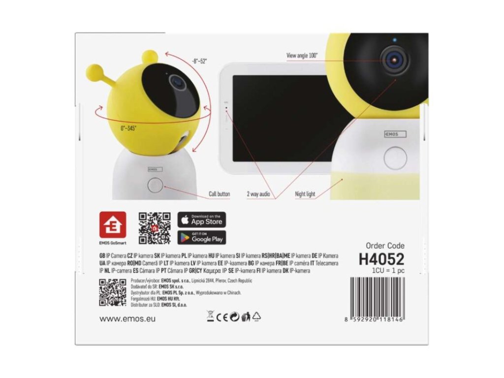 automatické ukladanie obrázkov: áno|ďalšie funkcie: detekcia detského plaču, prehrávanie uspávaniek|detekcia pohybu: áno|detekcia zvuku: áno|dosah detekcie pohybu: 10 metrov|farba: biela|funkcia WebRTC: áno|hlasová komunikácia: obojsmerný|hĺbka: 80 mm|inštalačný materiál: áno|IR CUT: nie|jazyky aplikácie: EN, CZ, SK, PL, DE, HU, SI, FR, + 60 ďalších jazykov|kompatibilita: EMOS GoSmart, TUYA, LIDL, Smartlife, otvorený systém|krytie: IP20|maximálny dosvit nočného videnie: 10 metrov|montáž: na stenu + na postavenie|motorizované otáčanie: áno|napájanie kamery: DC 5 V/1 A (súčasť balenia)|nastavenie oblasti detekcie: áno|nočné videnie: áno|notifikácie do mobilnej aplikácie: áno|obsah balenia: 1× kamera, 1× monitor, 2× napájací adaptér, 2× kábel USB, 1× držiak, 1× skrutky, 1× resetovací kolík, 1× príručka|ochrana proti odcudzeniu: blokované aplikáciou|ovládanie hlasovými asistentmi: áno|podpora ONVIF: áno|podporované OS: Android, iOS|predajný obal: 1 ks, krabica|prenosová frekvencia: 2,4 GHz WIFI (IEEE802.11b/g/n)|prídavné svetlo LED: nie|prídavný vnútorný monitor: áno|protokol: Wi-Fi|rozlíšenie kamery: 2 304 × 1 296|rozpoznávanie ľudského tela: áno|rozpoznávanie zvierat: nie|siréna: nie|šírka: 150 mm|sledovanie pohybu (tracking): áno|snímací prvok kamery: 1/2.8‘‘ 3 Megapixel CMOS|súkromný (privátny) režim: áno|typ držiaka: statívový závit|typ produktu: IP kamera|uhol detekcie pohybu: 100°|uhol záberu kamery: 100°|ukladanie na cloud: áno|ukladanie na kartu SD: áno|uskutočniť hovor pomocou tlačidla: áno|výdrž batérie: 5 hodín|výška: 80 mm|záručná doba: 2 roky|zdroj súčasťou balenia: ánoDodatočné parametre