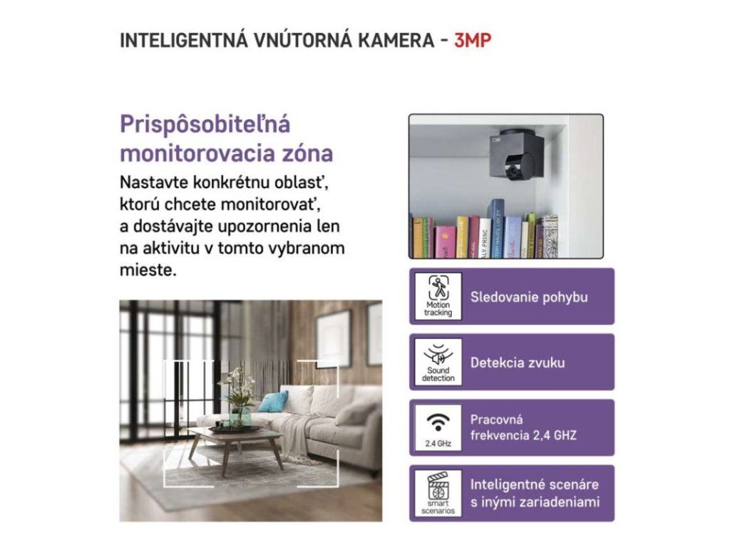 automatické ukladanie obrázkov: áno|ďalšie funkcie: –|detekcia pohybu: áno|detekcia zvuku: áno|dosah detekcie pohybu: 10 m|farba: čierna|funkcia WebRTC: áno|hlasová komunikácia: obojsmerný|hĺbka: 80 mm|inštalačný materiál: áno|IR CUT: áno|jazyky aplikácie: EN, CZ, SK, PL, DE, HU, SI, FR, + 60 ďalších jazykov|kompatibilita: EMOS GoSmart, TUYA, LIDL, Smartlife, otvorený systém|krytie: IP20|maximálny dosvit nočného videnie: 10 metrov|montáž: na stenu + na postavenie|motorizované otáčanie: áno|napájanie kamery: DC 5 V/1 A (súčasť balenia)|nastavenie oblasti detekcie: áno|nočné videnie: áno|notifikácie do mobilnej aplikácie: áno|obsah balenia: 1× kamera, 1× napájací adaptér, 1× kábel USB, 1× držiak, 1× lepiaca páska, 1× skrutky, 1× ochranná páska, 1× príručka|ochrana proti odcudzeniu: blokované aplikáciou|ovládanie hlasovými asistentmi: áno (Amazon Alexa, Google Assistant)|podpora ONVIF: áno|podporované OS: Android, iOS|predajný obal: 1 ks, krabica|prenosová frekvencia: 2,4 GHz WIFI (IEEE802.11b/g/n)|prídavné svetlo LED: nie|prídavný vnútorný monitor: nie|protokol: Wi-Fi|rozlíšenie kamery: 2 304 × 1 296|rozpoznávanie ľudského tela: nie|rozpoznávanie zvierat: nie|séria: GoSmart|siréna: nie|šírka: 150 mm|sledovanie pohybu (tracking): áno|snímací prvok kamery: 1/2.8‘‘ 3 Megapixel CMOS|súkromný (privátny) režim: áno|typ držiaka: #|typ produktu: IP kamera|uhol detekcie pohybu: 100°|uhol záberu kamery: 100°|ukladanie na cloud: áno|ukladanie na kartu SD: áno|uskutočniť hovor pomocou tlačidla: nie|výdrž batérie: –|výška: 80 mm|záručná doba: 2 roky|zdroj súčasťou balenia: ánoDodatočné parametre