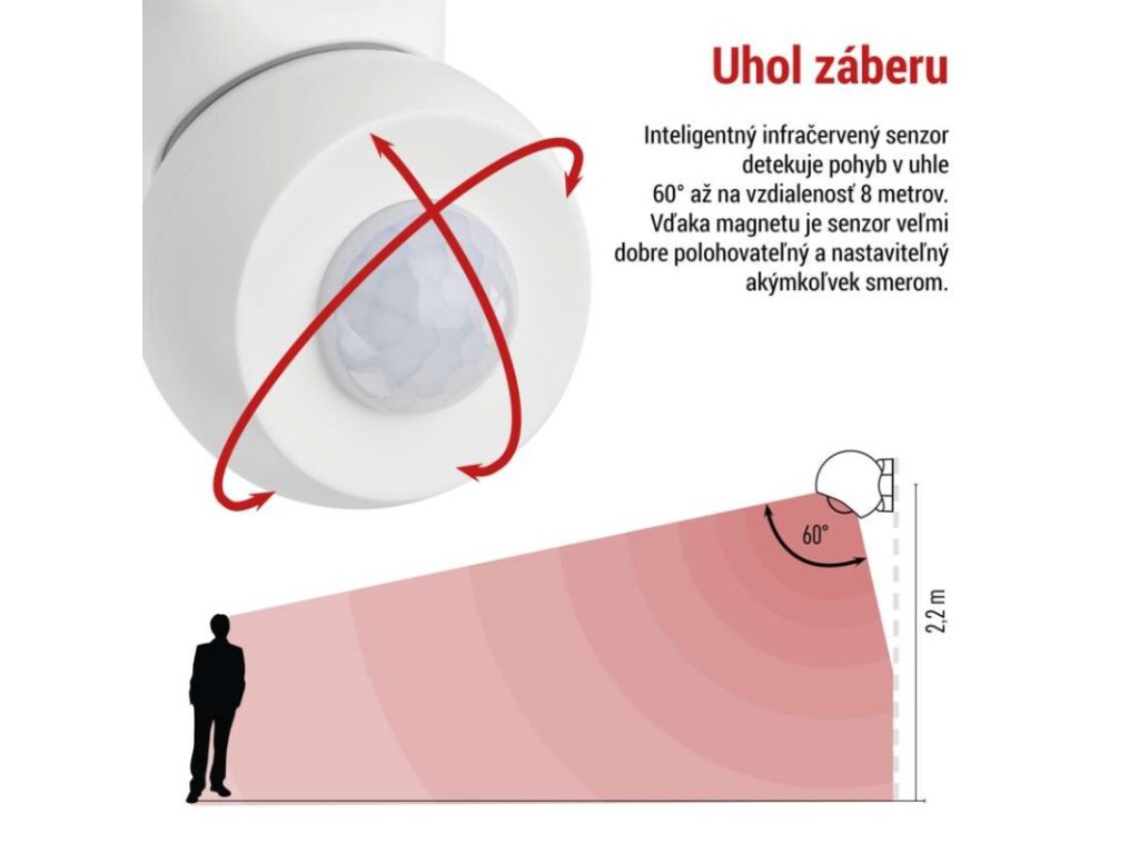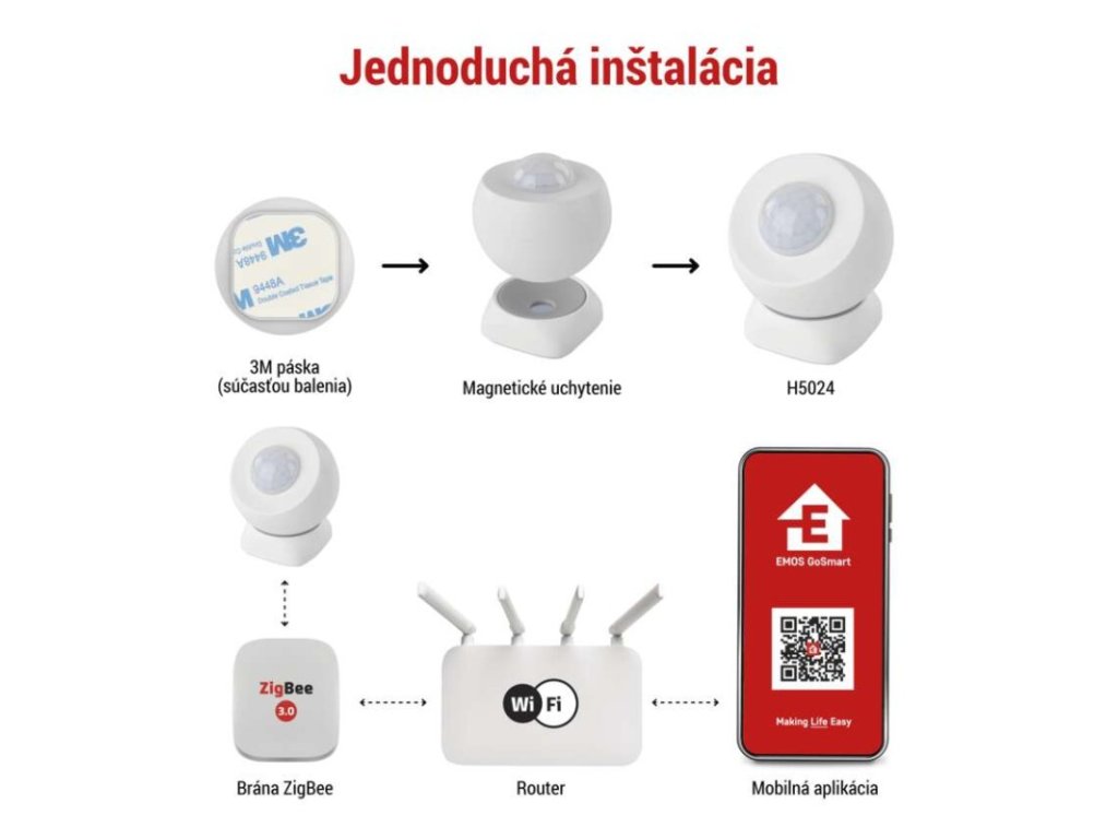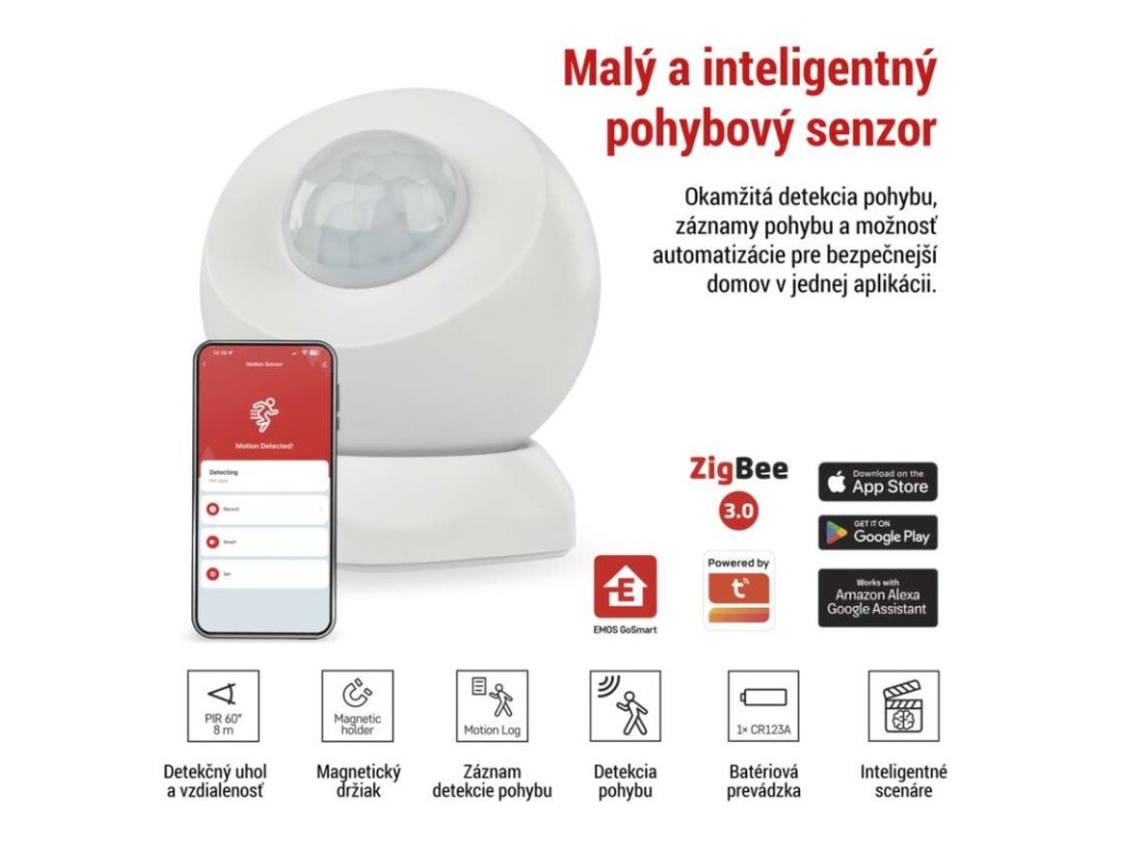 citlivosť: –|ďalšie funkcie: –|detekčný dosah: 8 m|detekčný uhol: 60°|doba zopnutia: neuvádza sa|farba: biela|hlasová komunikácia: nie|inštalačný materiál: 3M páska|jazyky aplikácie: EN, CZ, SK, PL, DE, HU, SI, FR, + 60 ďalších jazykov|kompatibilita: EMOS GoSmart, TUYA, LIDL, Smartlife, otvorený systém|krytie: IP20|max. záťaž kapacitná: –|max. záťaž odporová: –|napájanie: 1× CR123A (3 V)|notifikácie do mobilnej aplikácie: áno|ovládanie hlasovými asistentmi: nie|podporované OS: Android, iOS|predajný obal: 1 ks, papierová krabička|prenosová frekvencia: 2,4 GHz ZigBee (IEEE 802.15.4)|produkt: pohybové čidlo|protokol: Zigbee 3.0|rozmer: 50 × 50 × 55 mm|typ senzora: PIR|ukladanie na cloud: nie|ukladanie na kartu SD: nieDodatočné parametre