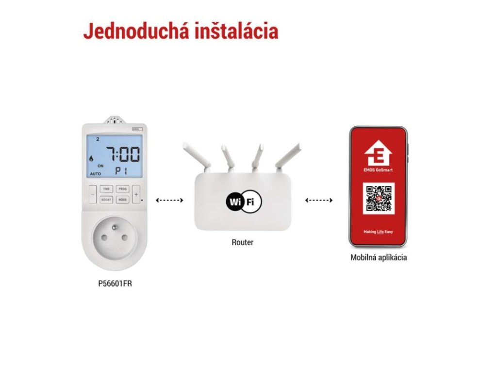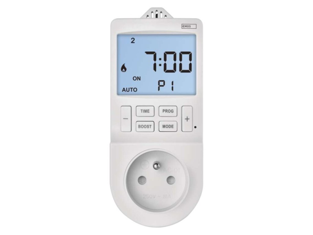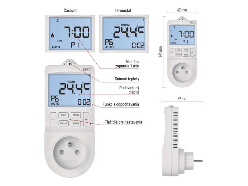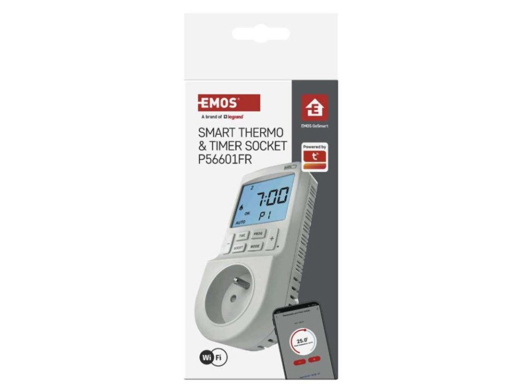 #: #|#: GoSmart|#: Wi-Fi|#: áno|#: EMOS GoSmart, TUYA, LIDL, Smartlife, otvorený systém|#: EN, CZ, SK, PL, DE, HU, SI, FR, + 60 ďalších jazykov|#: Android, iOS|#: #|detské clonky: áno|druh: digitálna|druh regulácie: vykurovací a chladiaci systém|energetická trieda: #|farba: biela|funkcia odpočítavania countdown: nie|funkcia ON/OFF: áno|funkcia zmeny letný / zimný čas: áno|kalibrácia teploty: áno|krytie: IP30|max. záťaž: 3 680 W|meranie teploty: 0 °C až 45 °C, rozlišenie 0,1 °C|minimálna doba zopnutia: 1 minúta|možnosť ručného zapnutia: áno|napätie/prúd: 230 V~/16 A max.|nastavenie teploty: 5 °C až 40 °C, rozlišenie 0,5 °C|nastaviteľný rozptyl teploty: 0,2 °C až 2 °C, po 0,1 °C|ochrana proti zamrznutiu: nie|počet programov pre časovač: 24|počet programov pre termostat: užívateľsky nastaviteľná teplota (6× za deň)|počet spínaní za deň pre časovač: 24|podsvietený displej: áno|predajný obal: 1 ks, krabička|rozmer: 82 × 62 × 146 mm|spína: fázový vodič|spínaná záťaž: 16 A odporovo, 4 A induktívne|spínanie: 230 V AC alebo beznapäťové|súčasť balenia: #|typ nastavenia teploty: 6 teplotných zmien denne|typ ovládania: programovateľný elektronický izbový termostat, možnosť ovládania cez mobil (iOS, Android)|typ termostatu: zásuvkový|vonkajšie použitie: nie|záložný akumulátor: nie|záručná doba: 2 rokyDodatočné parametre