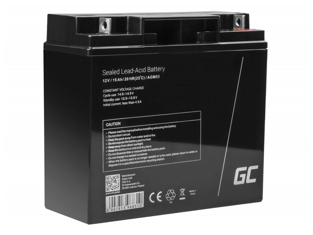 Bezúdržbová olovená batéria Green Cell AGM53 VRLA 12V 15Ah napr. pre alarmy, pokladne, invalidné vozíky, člny či hračky a pod.