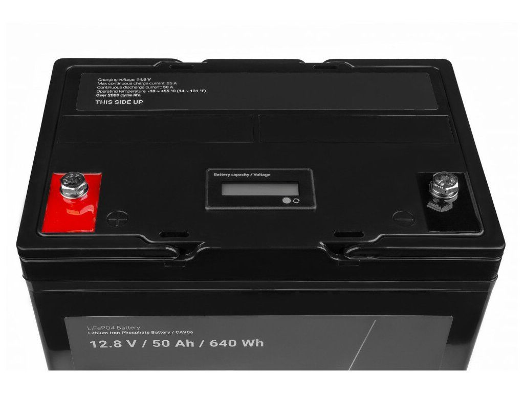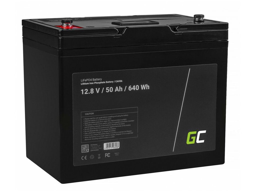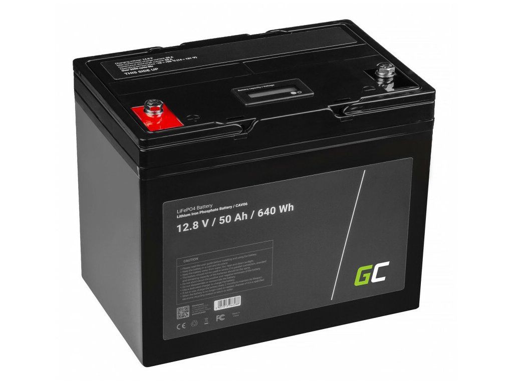 Lítium-železo-fosfátová batéria Green Cell CAV06 LiFePO4 Battery 50 Ah 12.8.V 640Wh vhodná pre solárne panely, obytné automobily a člny. Vyznačuje sa vynikajúcou odolnosťou, aktuálnym výkonom a rýchlosťou nabíjania. Má tiež dlhšiu životnosť a je ľahšou alternatívou k oloveným akumulátorom.