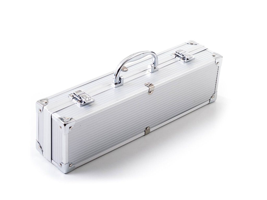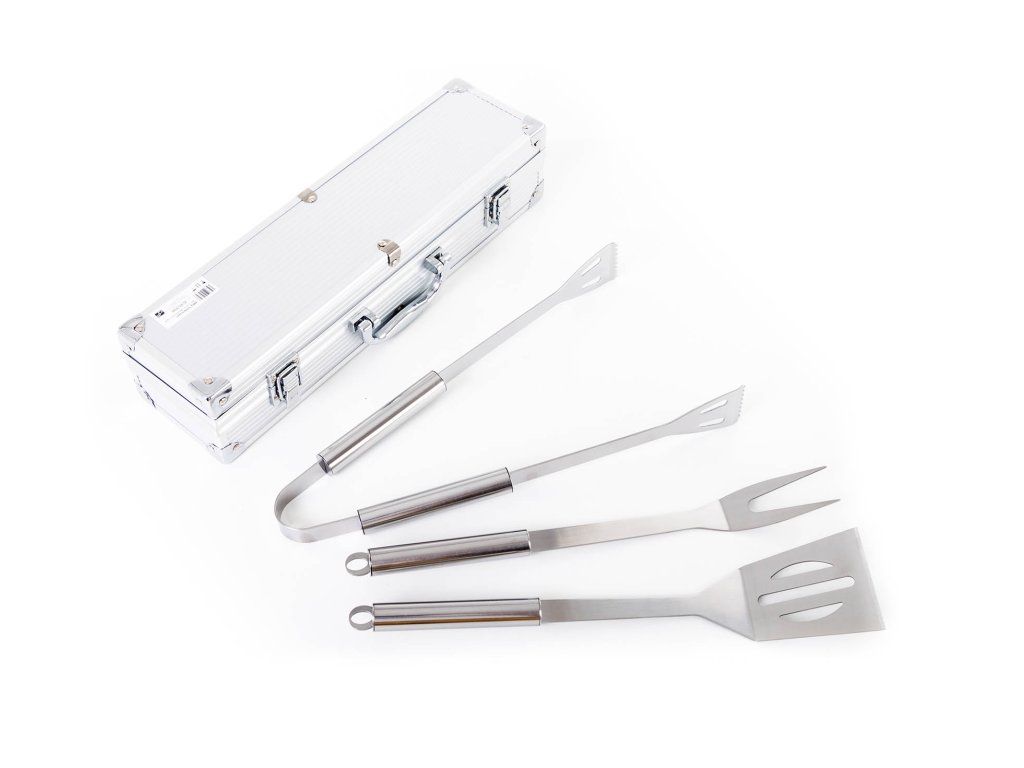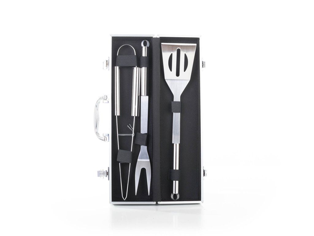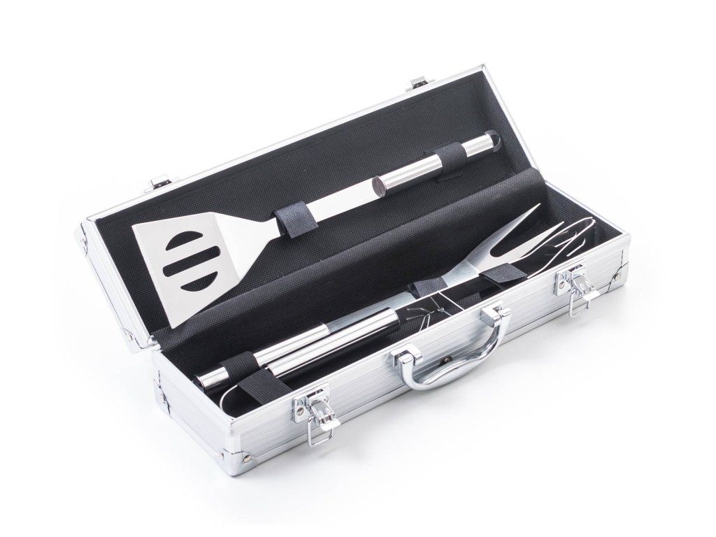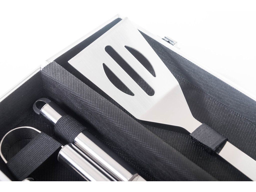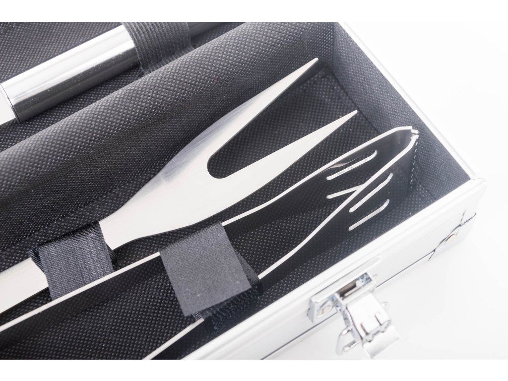 Sada obsahuje kompletné nástroje pre grilovanie bez ťažkostí. Súčasťou sady je obracačka, vidlička a kliešte s dĺžkou 34 cm. Pre ľahké prenášanie a skladovanie je náradie uložené do praktického hliníkového kufra.