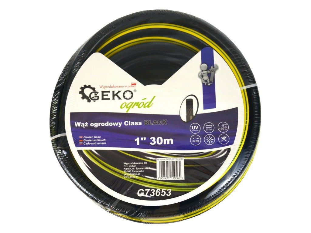 Kvalitní zahradní hadice GEKO s ochranou proti UV záření se vyznačuje vysokou flexibilitou, odolností vůči povětrnostním vlivům, odolností proti mechanickému poškození díky 3vrstvé struktuře a její vnitřní část je odolná proti tvorbě a zachytávání řas. Výztuž hadice je vyrobena z vysokopevnostního polyesteru a je možné s ní pracovat při teplotách od -5°C do +30°C. Zvýšená tuhost zabraňuje jejímu zauzlování a kroucení. Tato hadice je vhodná k zavlažování na zahradách, chatách a chalupách.Technické parametry: