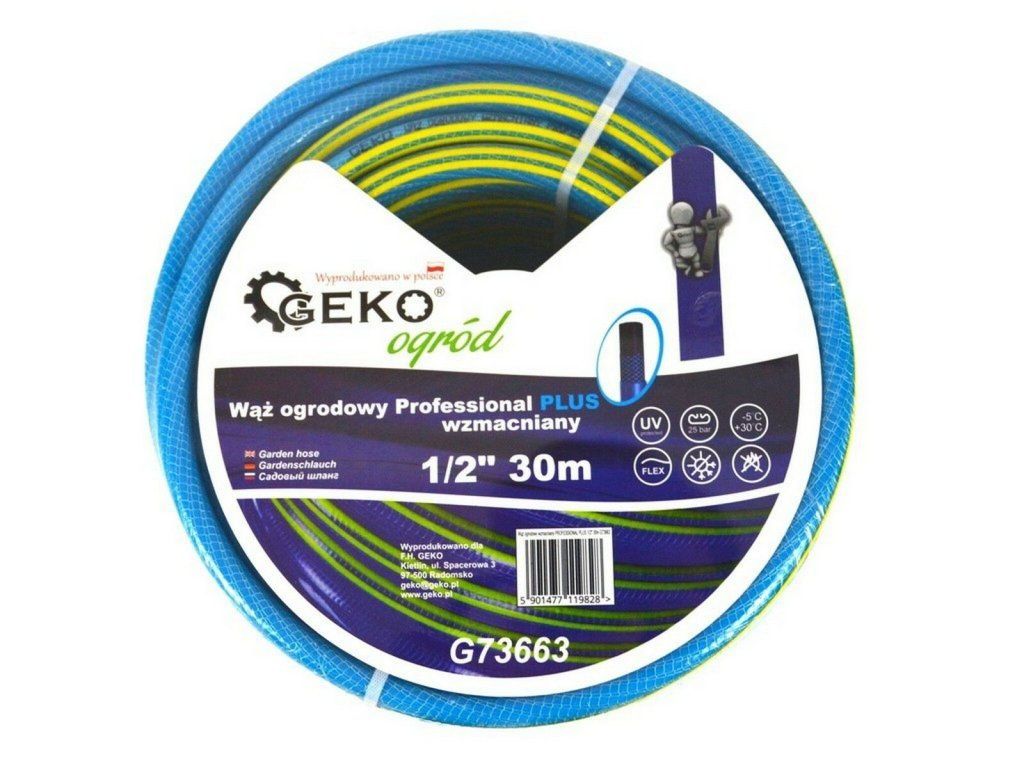 Kvalitní zahradní hadice GEKO s ochranou proti UV záření se vyznačuje vysokou flexibilitou, odolností vůči povětrnostním vlivům, odolností proti mechanickému poškození díky 4vrstvé struktuře a její vnitřní část je odolná proti tvorbě a zachytávání řas. Výztuž hadice je vyrobena z vysokopevnostního polyesteru a je možné s ní pracovat při teplotách od -5°C do +30°C. Zvýšená tuhost zabraňuje jejímu zauzlování a kroucení. Tato hadice je vhodná k zavlažování na zahradách, chatách a chalupách.Technické parametry: