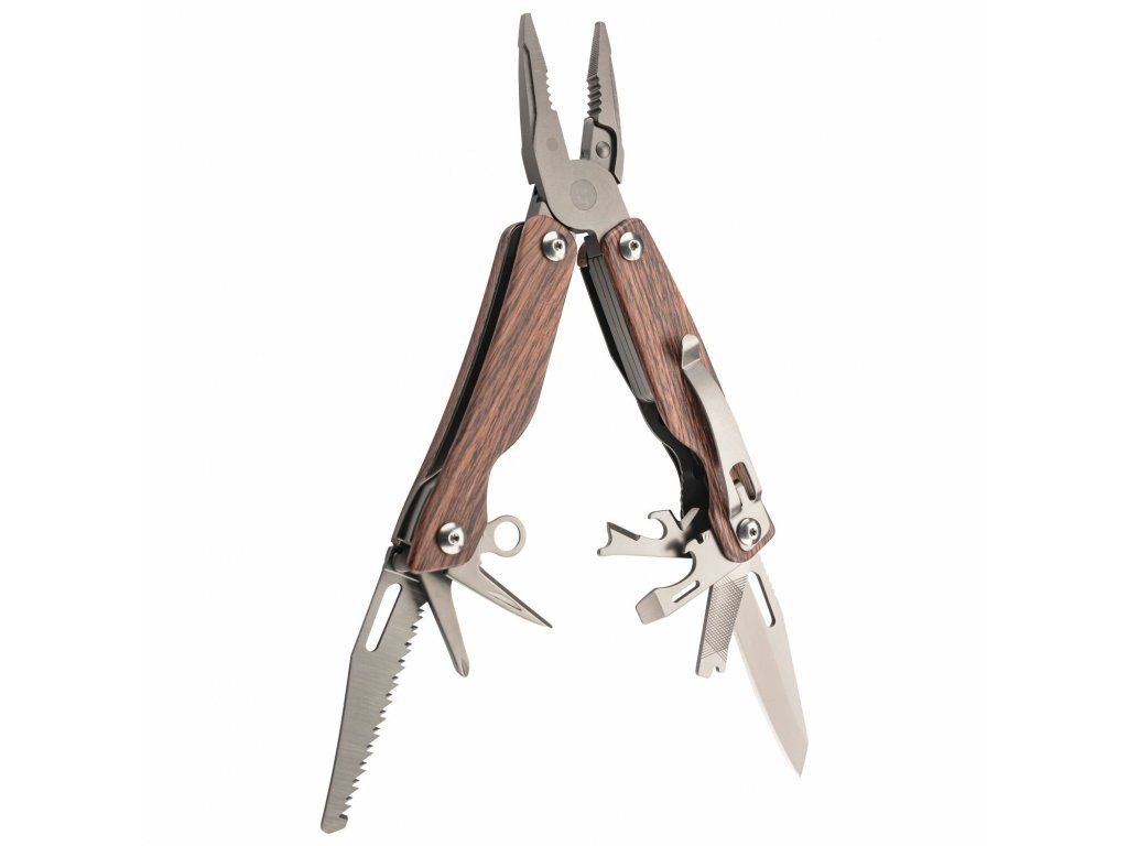 Multifunkčné náradie Herbertz 106700 Holzoptik sa odporúča na použitie v prírode na prežitie, bushcraft, turistiku a pod. S titánovým povrchom a plastovou rukoväťou so vzhľadom dreva.